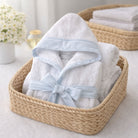 Elevate your little one's bath time routine with this soft white cotton towelling bathrobe. Adorned with white and blue gingham trims and a blue piping, it comes beautifully packaged in a gift box. Complete with pockets and a front fastening attached tie belt, this bathrobe can also be personalised on the front or back, making it a truly unique and thoughtful gift.