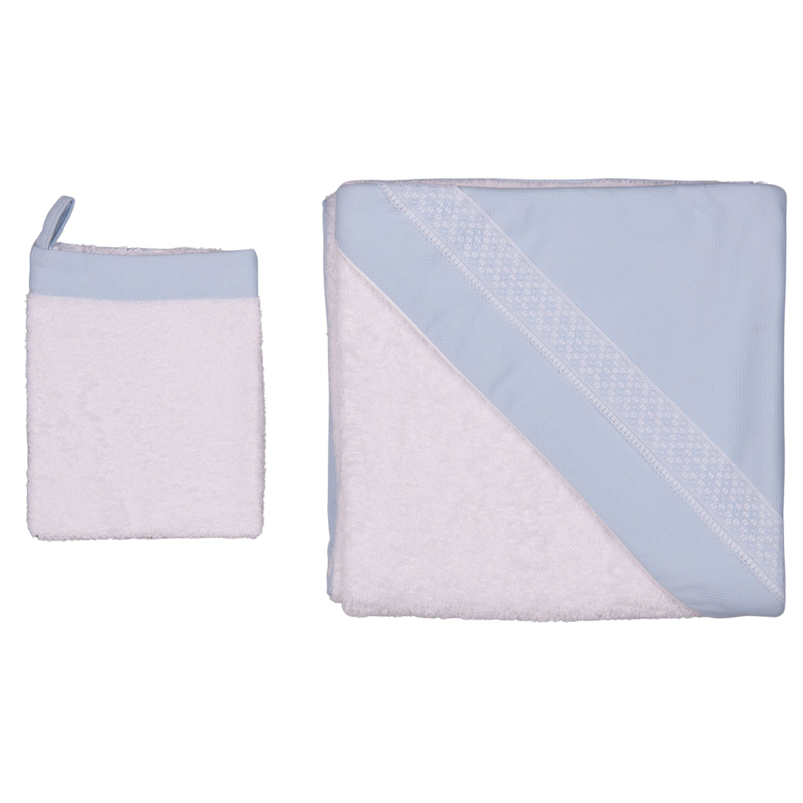 CLASSIC | Boys Blue Cotton Hooded Towel & Mitt Set with Lace Detailing
