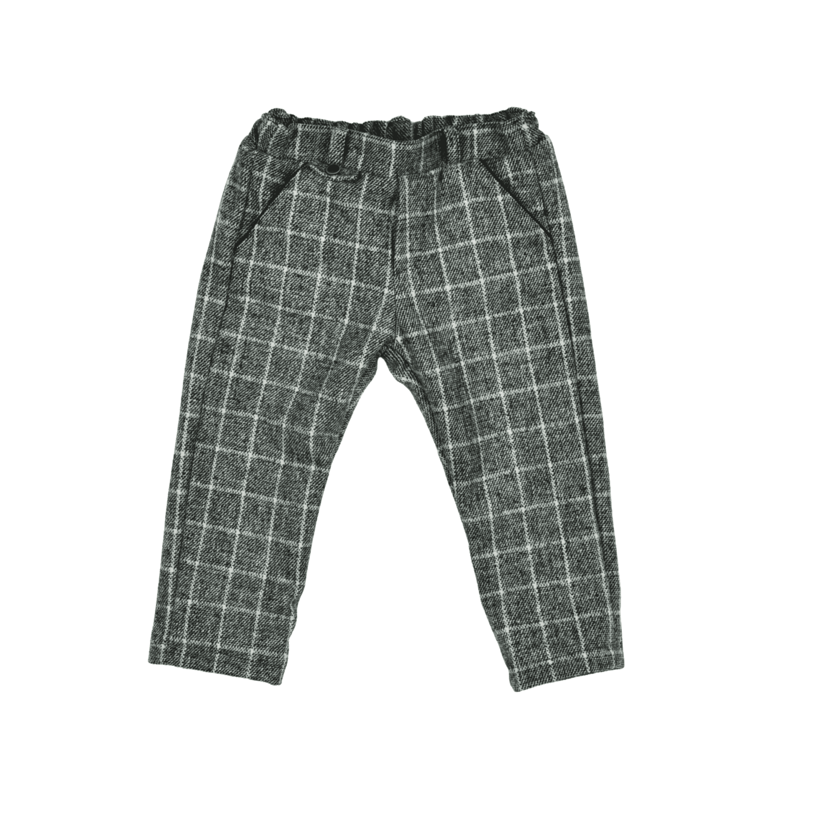 Made from a comfortable flannel and lined with soft cotton jersey, these grey and ivory checkered trousers are a smart choice for little boys. They feature stant front pockets and an elasticated waist with an adjustable waistband, available in all sizes.