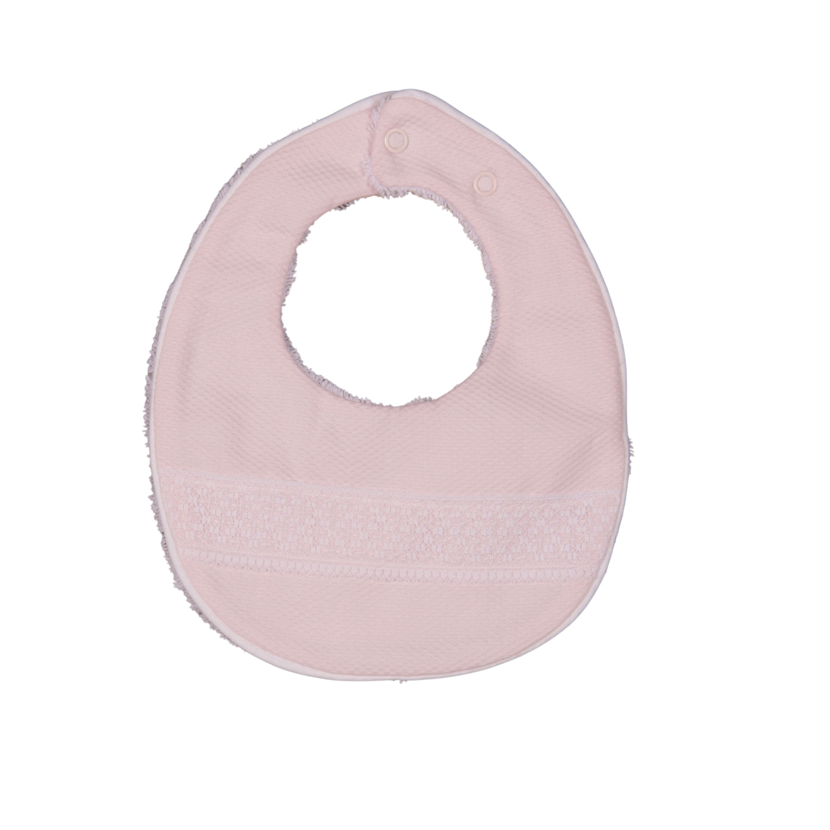 The Classic girls' cotton bib in a delicate pale pink is adorned with a fine white lace trim. It fastens securely with a single popper at the neck and is lined with plush towelling, capturing the enduring elegance synonymous with Bébé Sweeny.