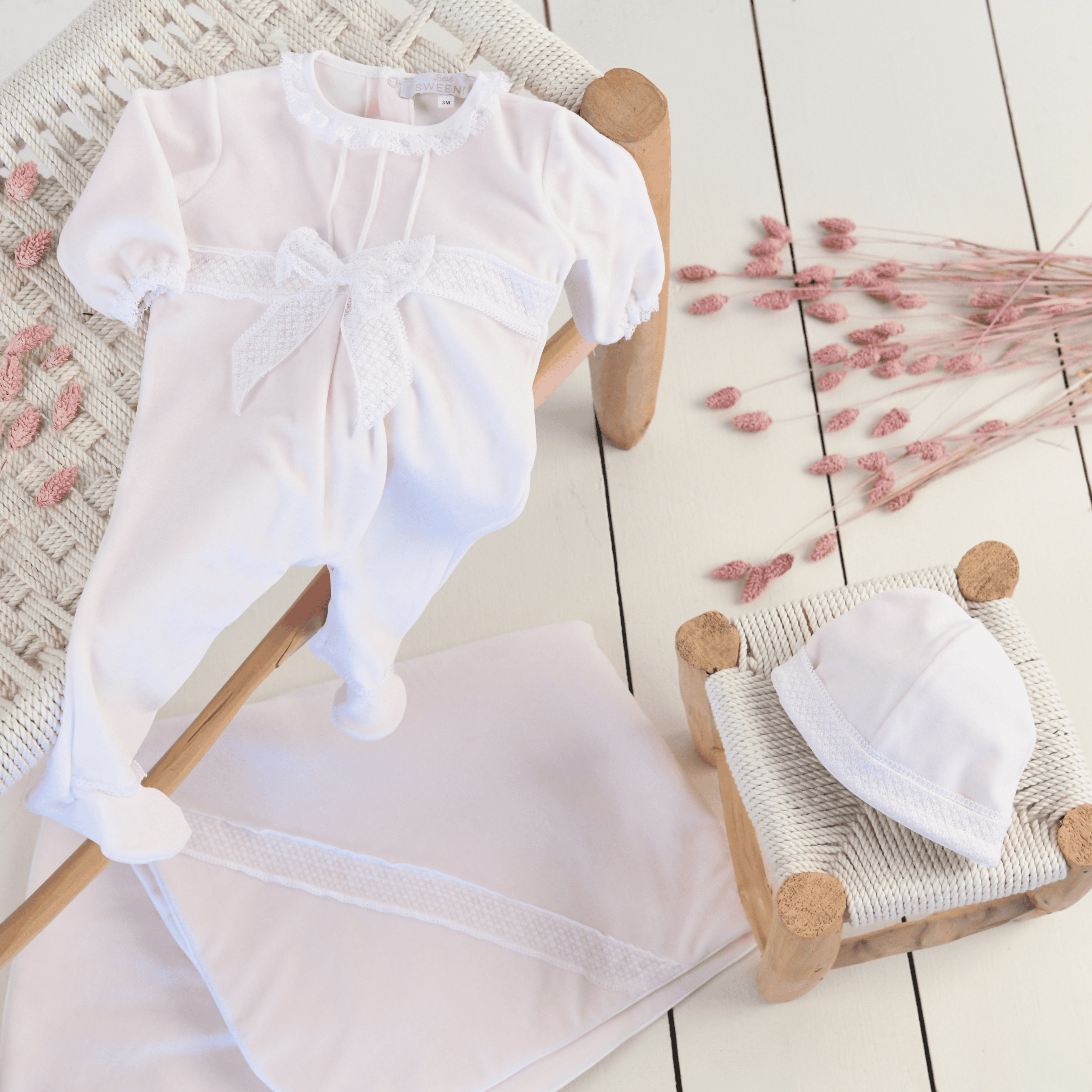 Our Classic Collection revisits timeless baby essentials. From bibs and onesies to bath capes, swaddles, blankets and bonnets - all available in white, pink and blue, the traditional baby colors, delicately finished with white lace and piping details.