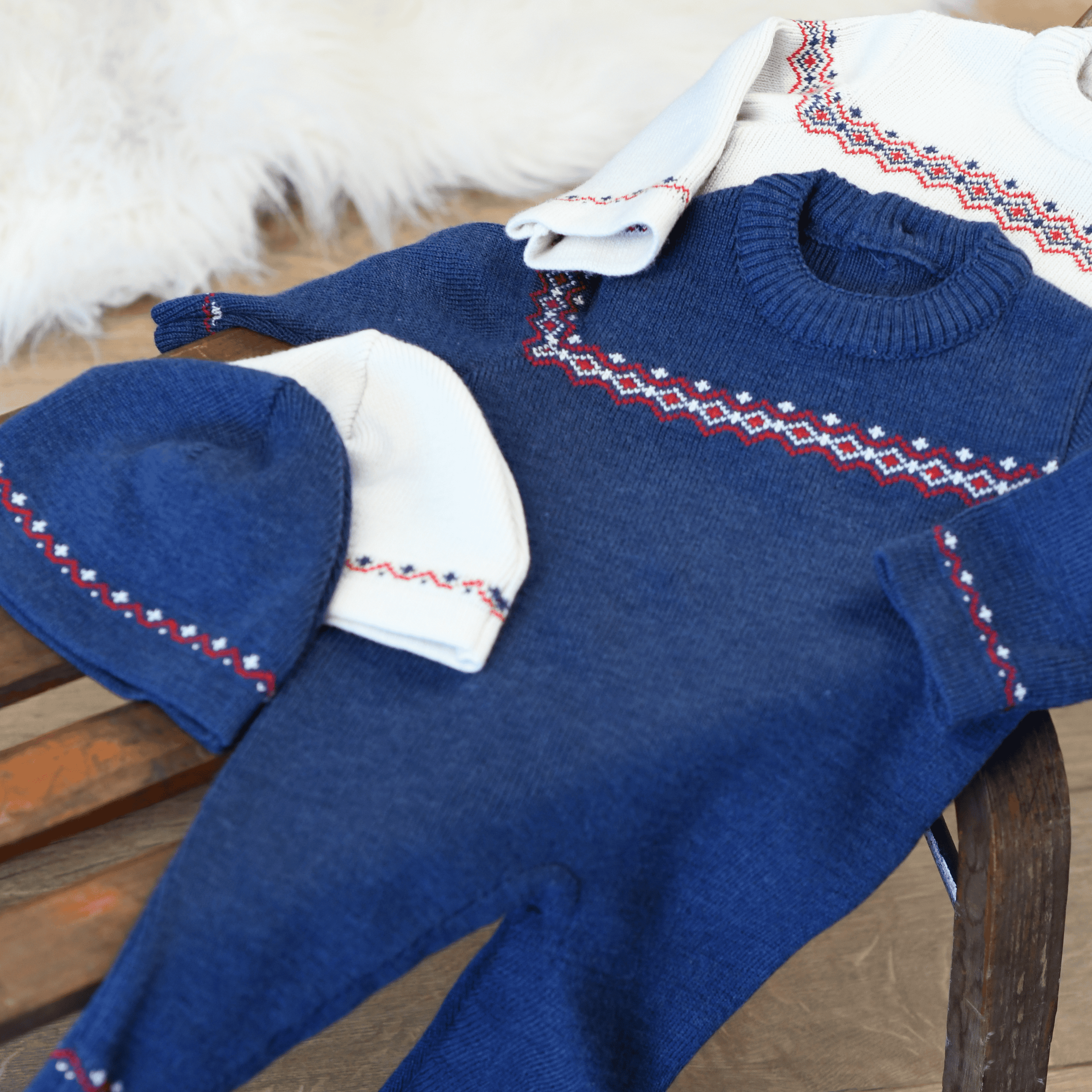 This navy blue beanie for young boys is crafted from a soft wool blend and features a charming snowflake pattern. It pairs seamlessly with the Brent two-piece set or the coordinating romper from the same collection, offering both warmth and style.