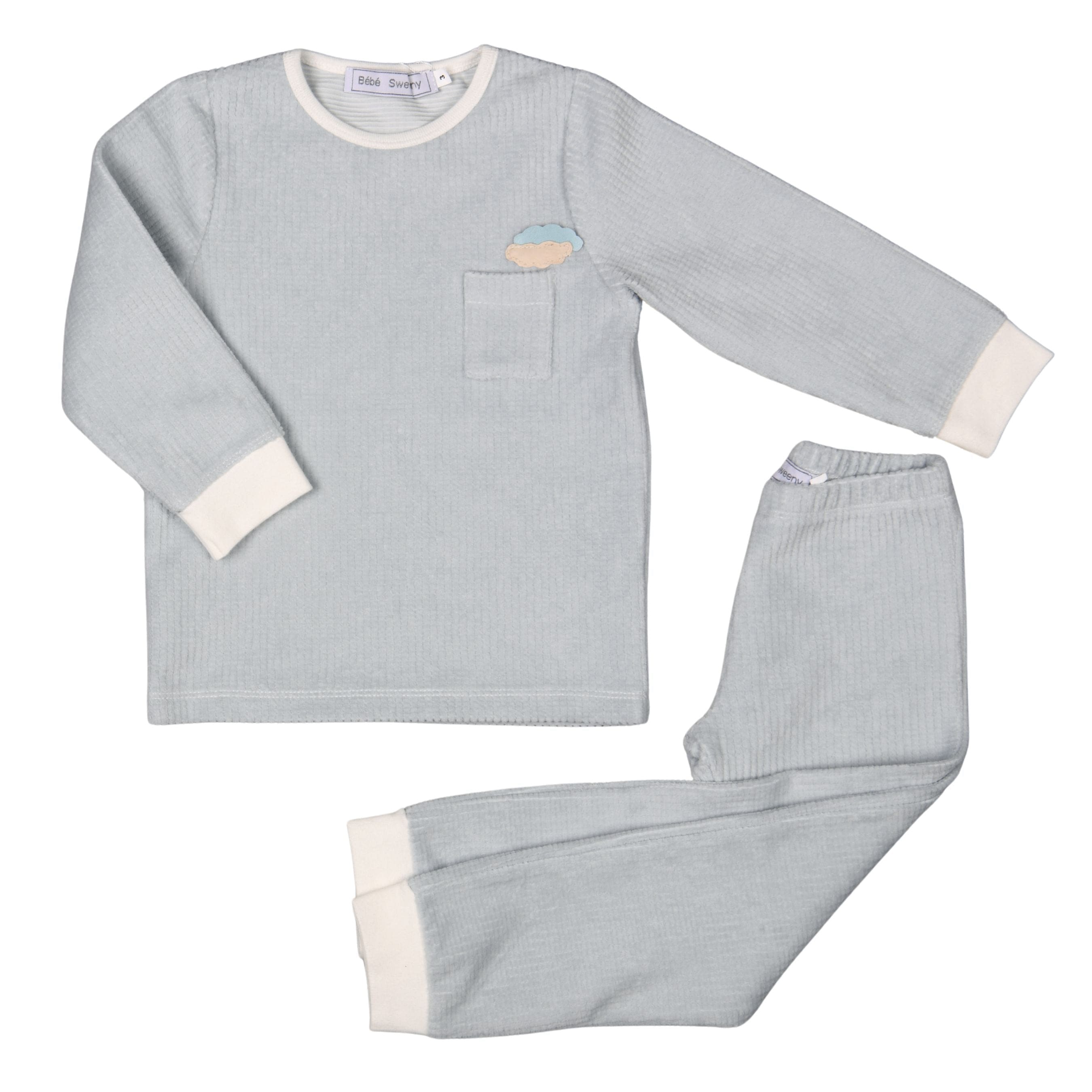 Beautifully soft and cosy, this light blue 2 piece set for boys is made in stretchy and comfortable velour.  Patterned with small squares in relief, the long-sleeved top has a rounded neckline and the matching bottoms have narrow cuffs and an elasticated waist. The patch pocket has a blue and beige decorative faux leather cloud sewn above.