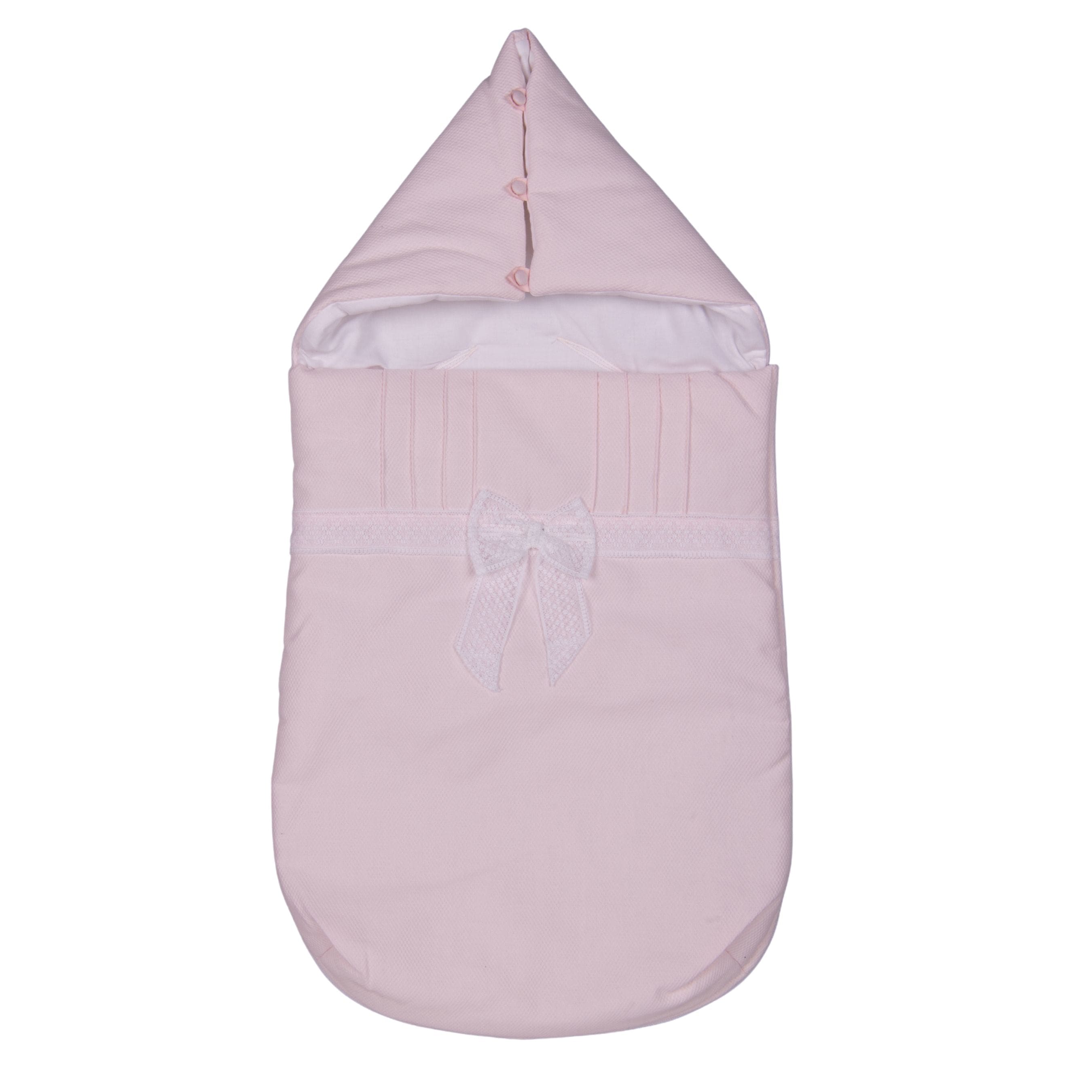 Beautiful pink nest for baby girls, woven in luxurious cotton piqué with a soft jersey lining. Lightly padded for warmth, the elegant design features a delicate lace trim and bow on the front. Featuring a zip closure that enables the nest to fully open and lay flat, complemented by buttons on the hood for secure adjustment.