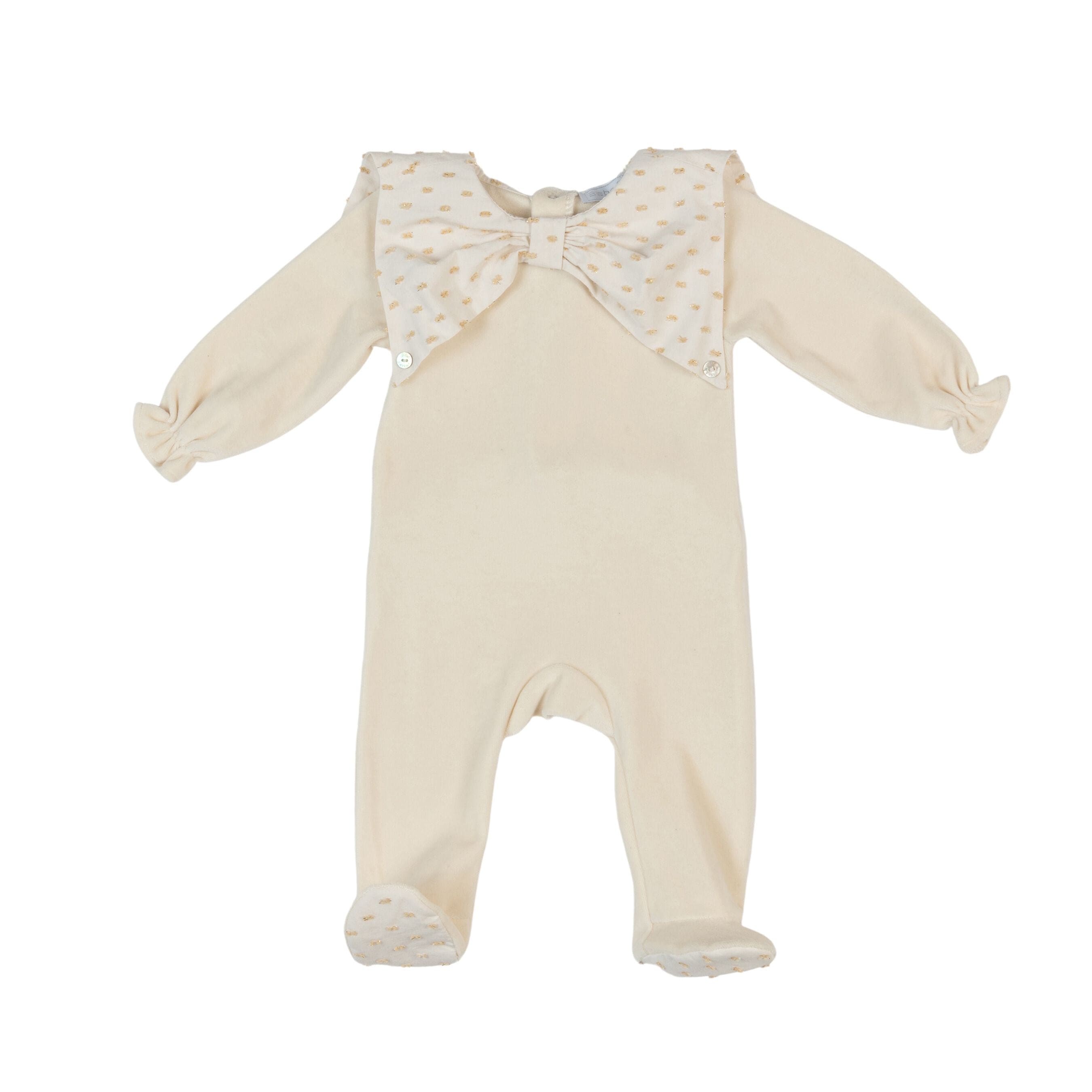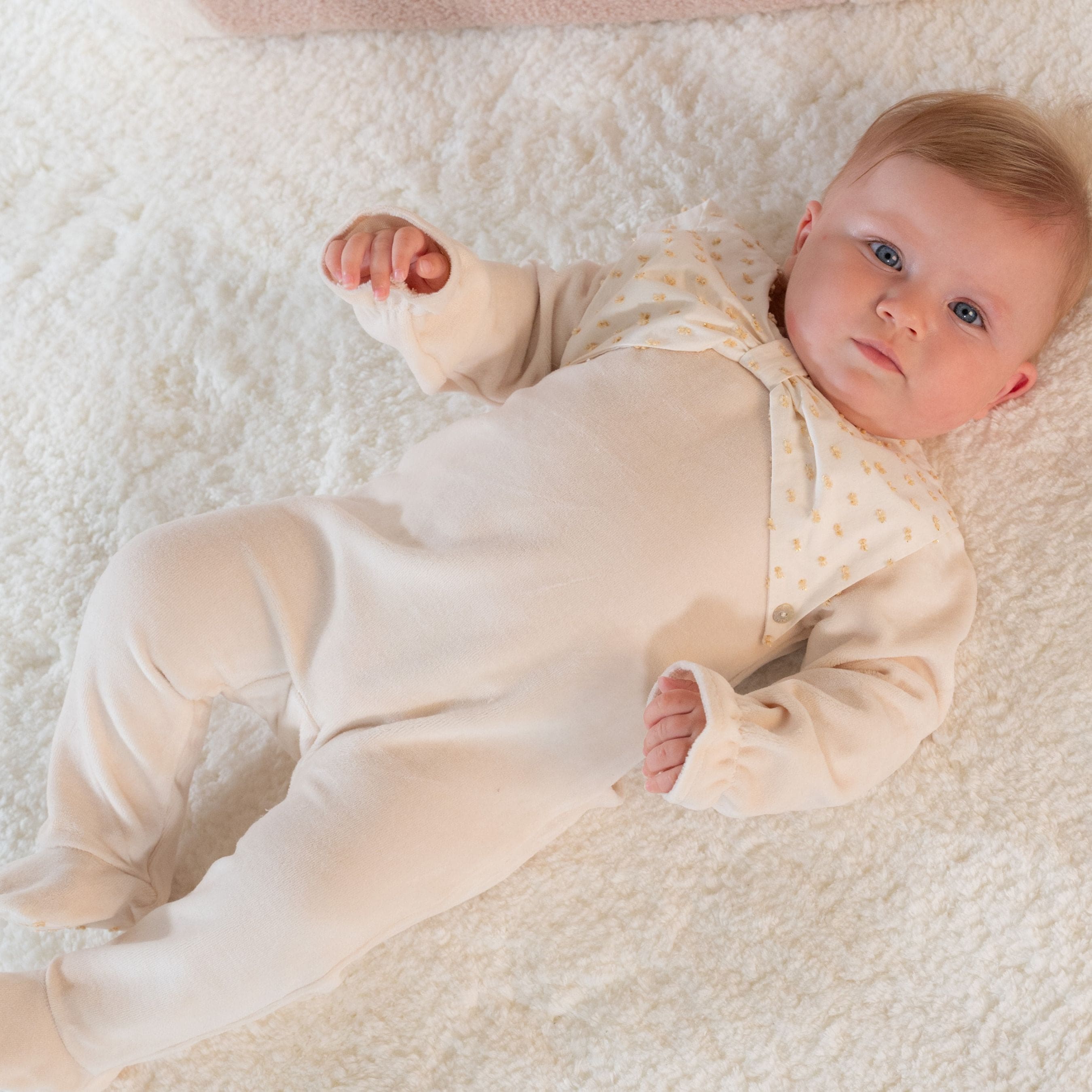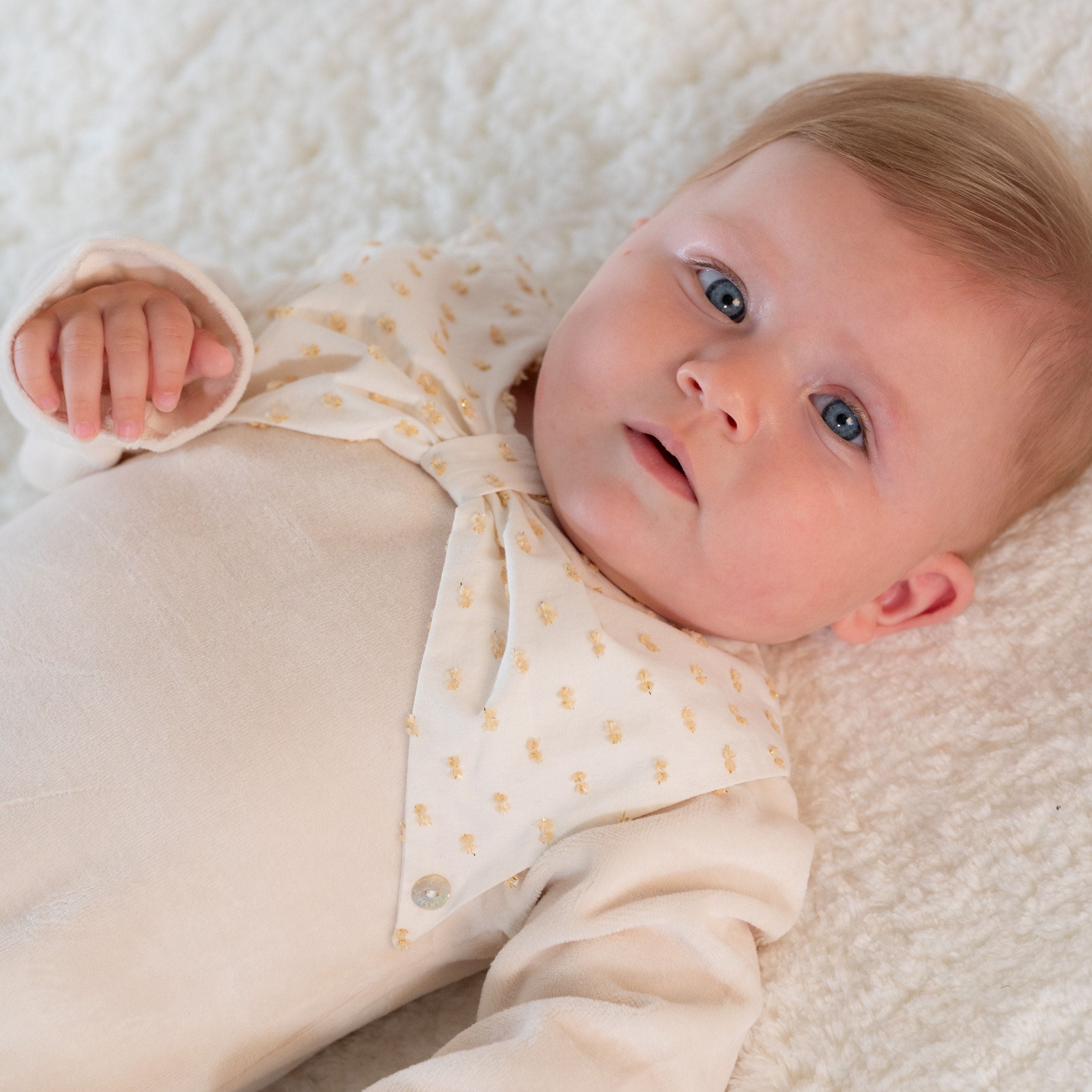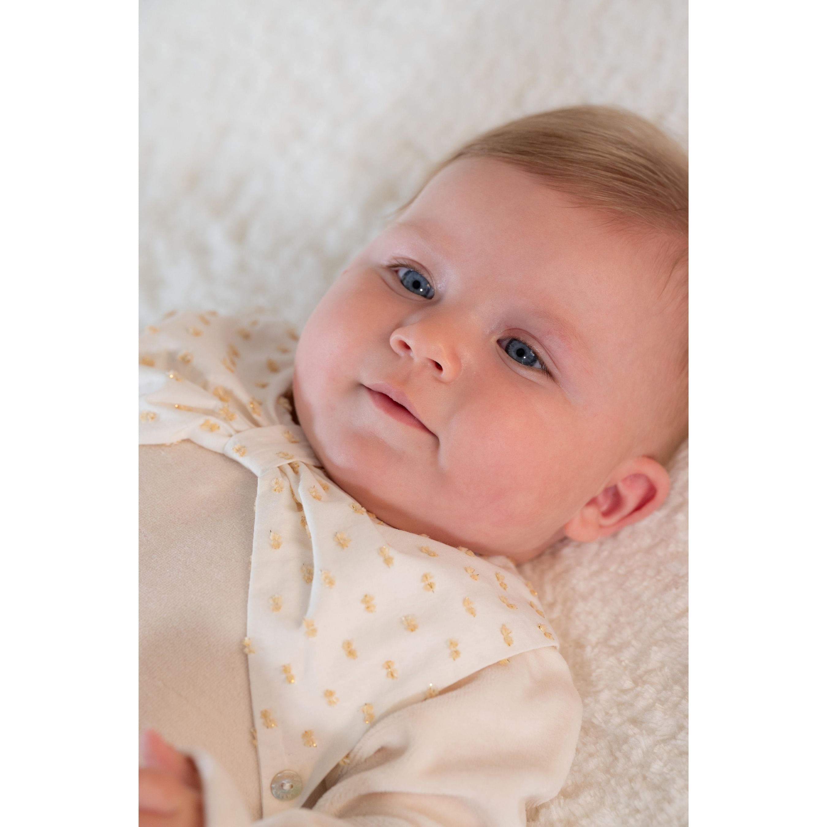 A charming ivory all-in-one for girls made from super soft cotton velour with a pretty collar embroidered with gold polka dots. The ivory cotton bib-style collar is held by 2 buttons on the front and a seam on each shoulder. It is finished with stretchy ruffled cuffs and helpful popper fastenings on the back. The matching hat is available to complete this adorable outfit.