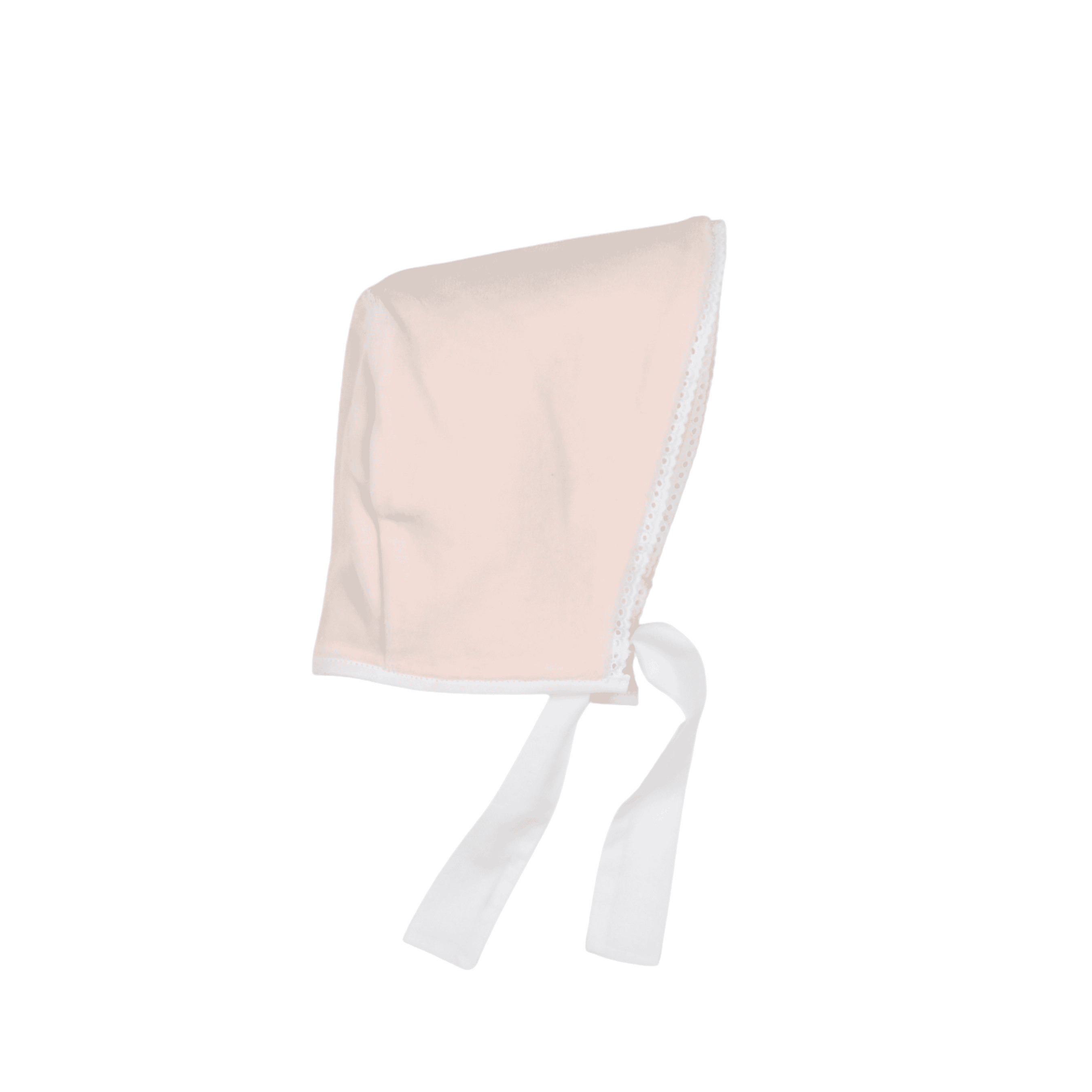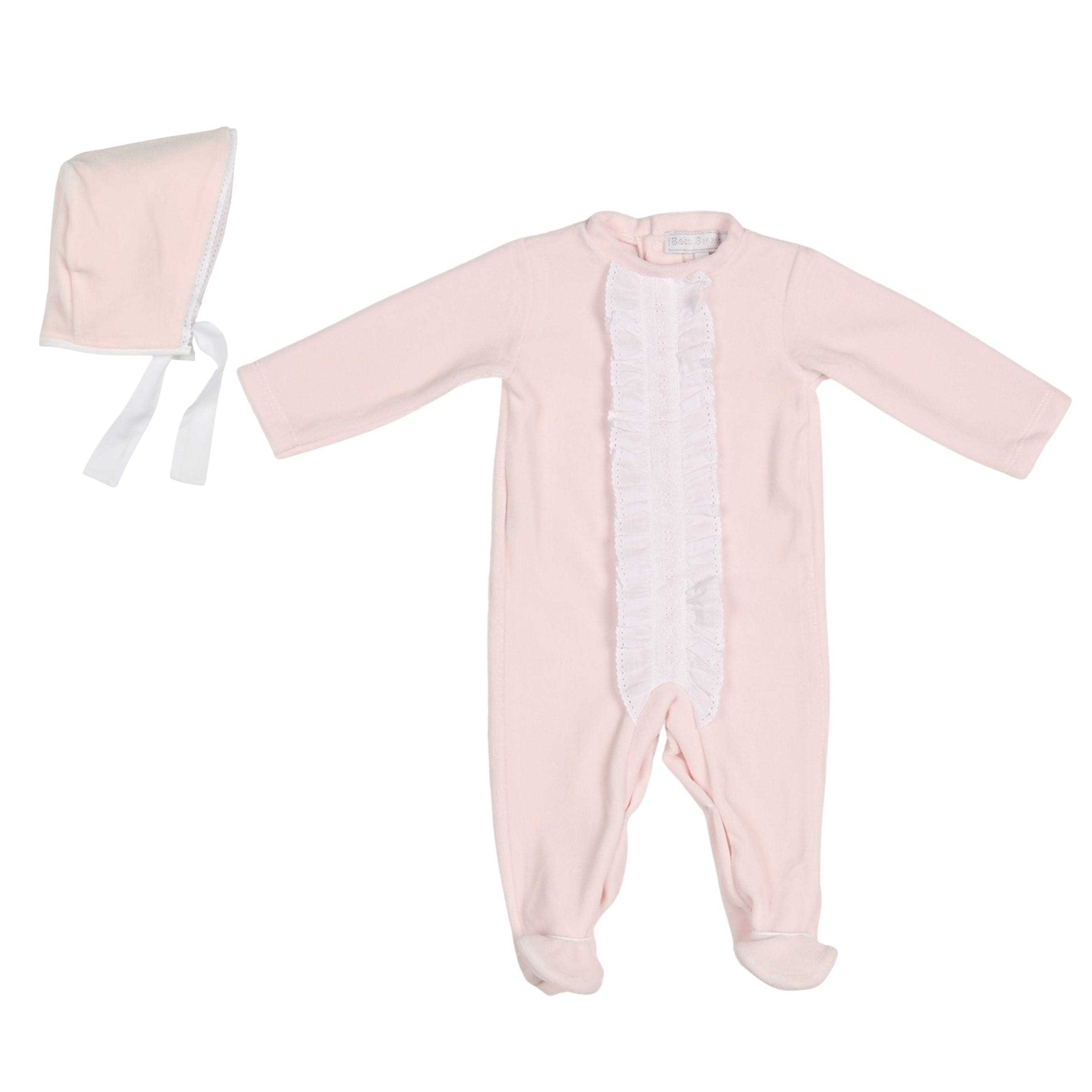 Light pink velour all-in-one set for girls. This charming two-piece set includes an all-in-one and bonnet. Super soft and stretchy, the babygrow has a white lace ribbon on the front and popper fastenings between the legs and on the back. The layette hat has a cute lace trim around the front with ties under the chin and is lined with lightweight cotton jersey, ideal for comfort.