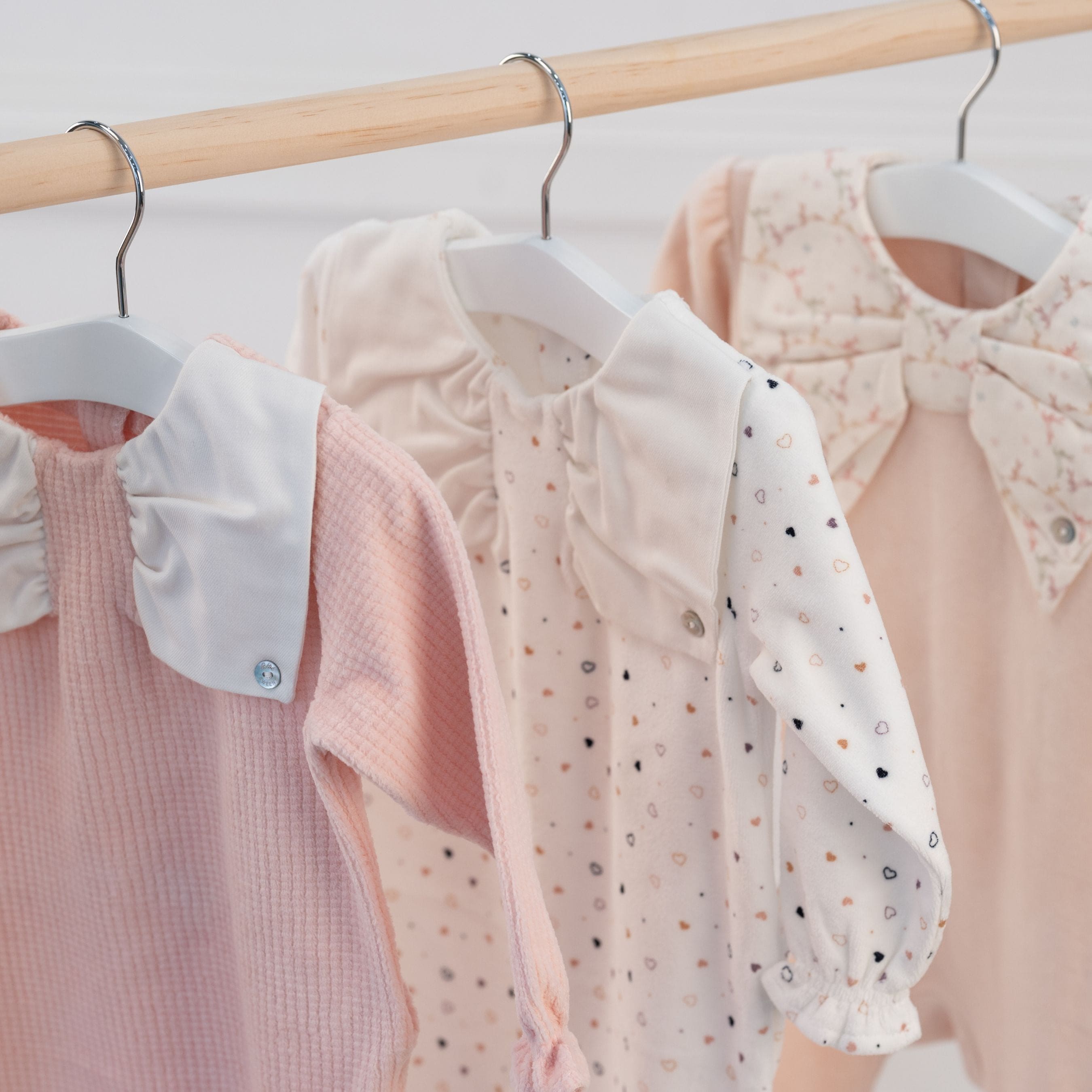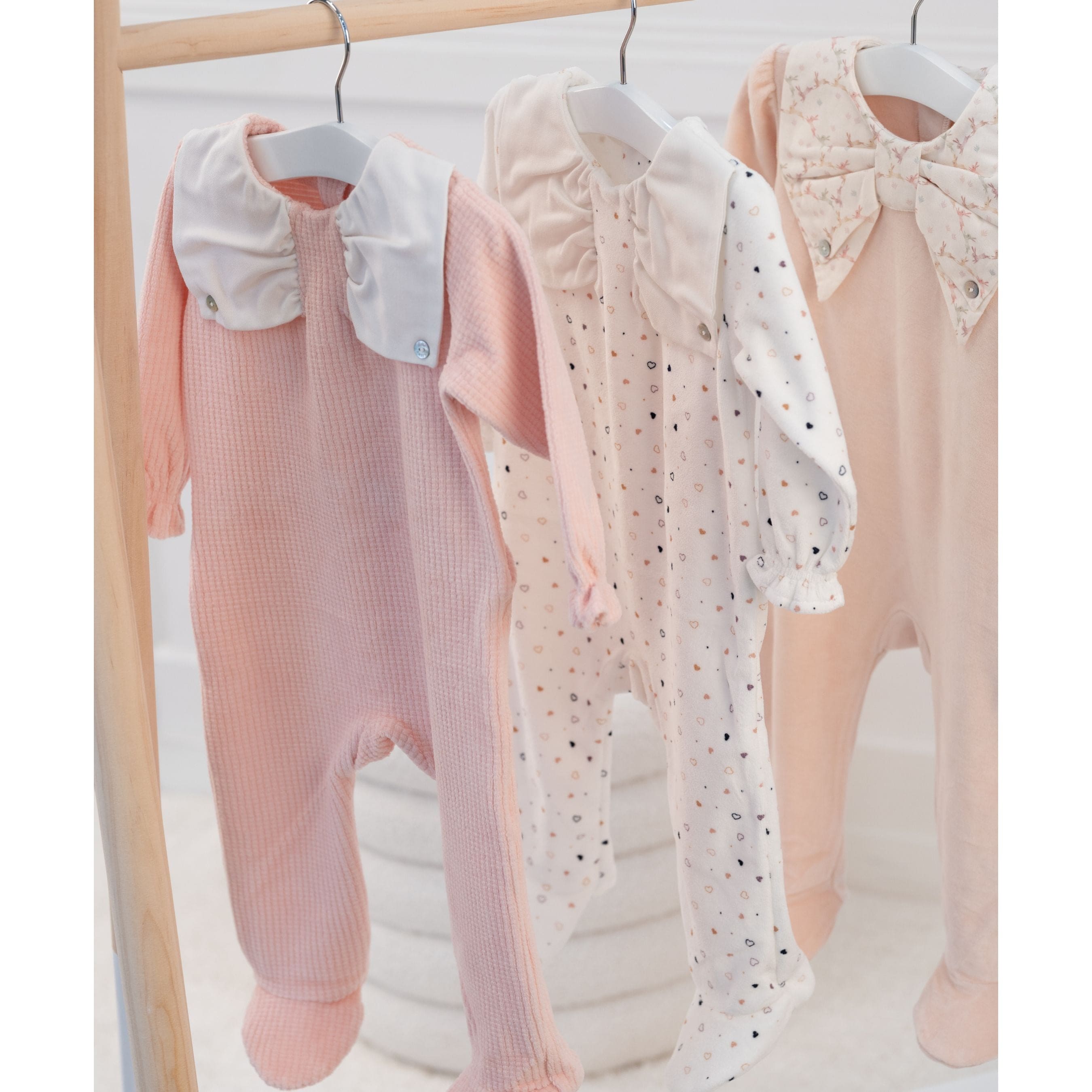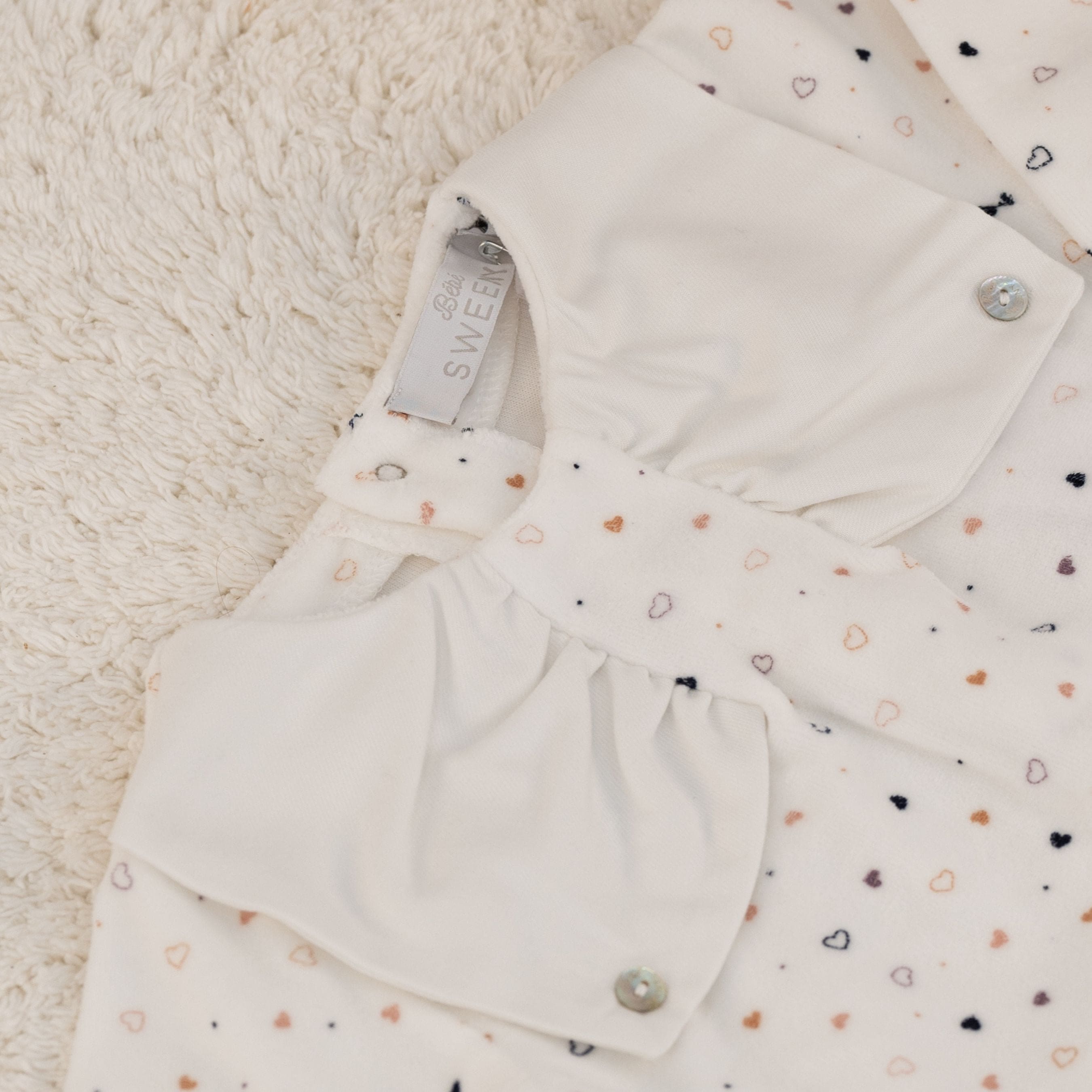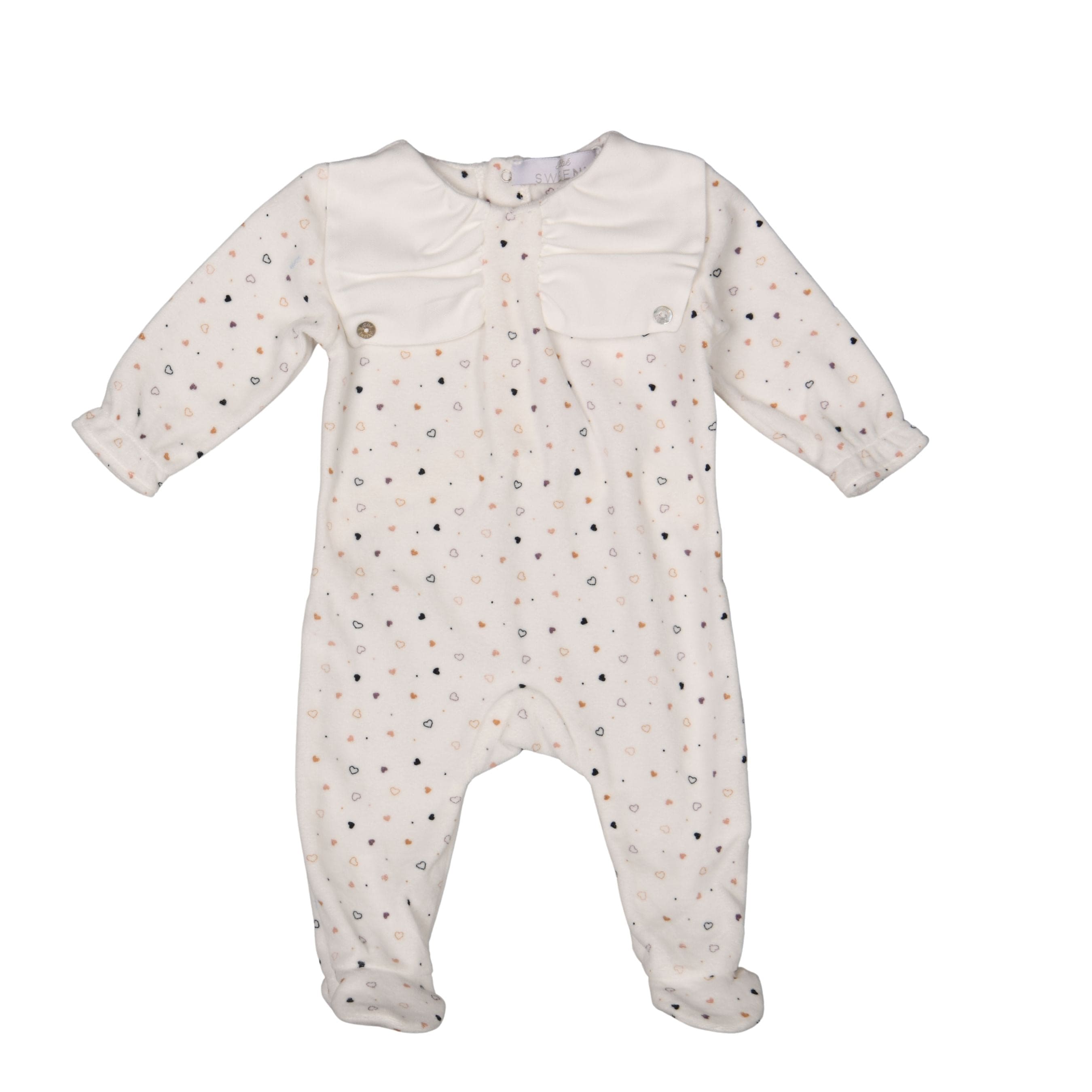 This ivory all-in-one features a delicate heart print and a soft, stretchy cotton-rich velour material, perfect for keeping baby cozy and comfortable. The adorable bow-shaped collar is made of ivory poplin and secured with a mother-of-pearl button logo on each side. Fastens easily with poppers on the back for convenient changing.