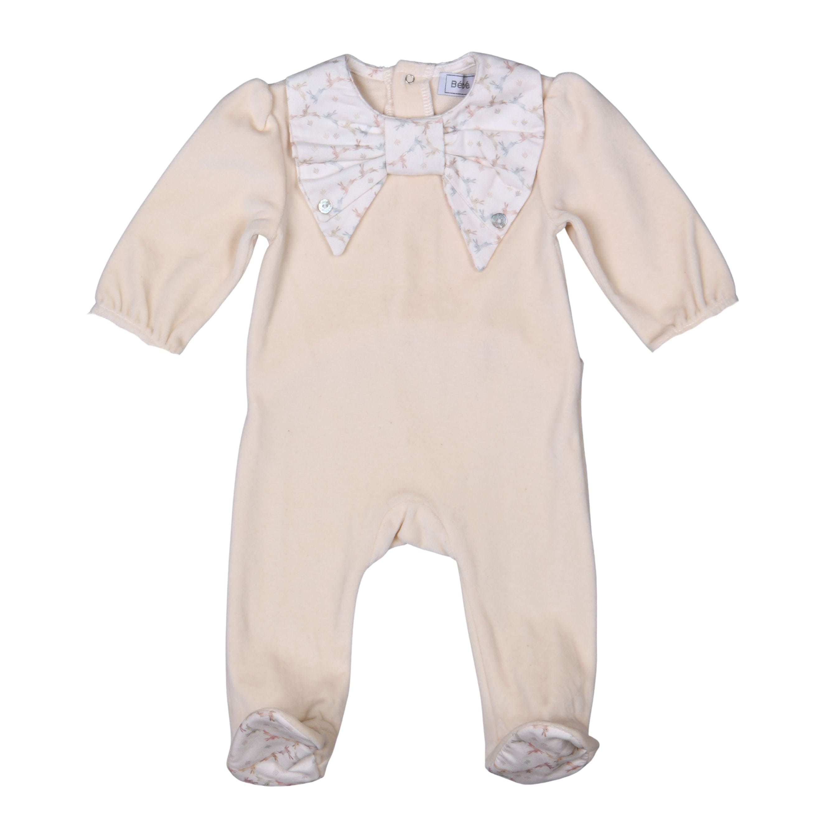 This all-in-one for girls is made from soft beige cotton velour. It's ideal for keeping your little one warm and snug, while the charming bow-shaped collar features an ivory print poplin and is fastened with a mother-of-pearl button on each side. With puffed sleeves adding a touch of sophistication, this garment easily fastens with poppers on the back for effortless changing.