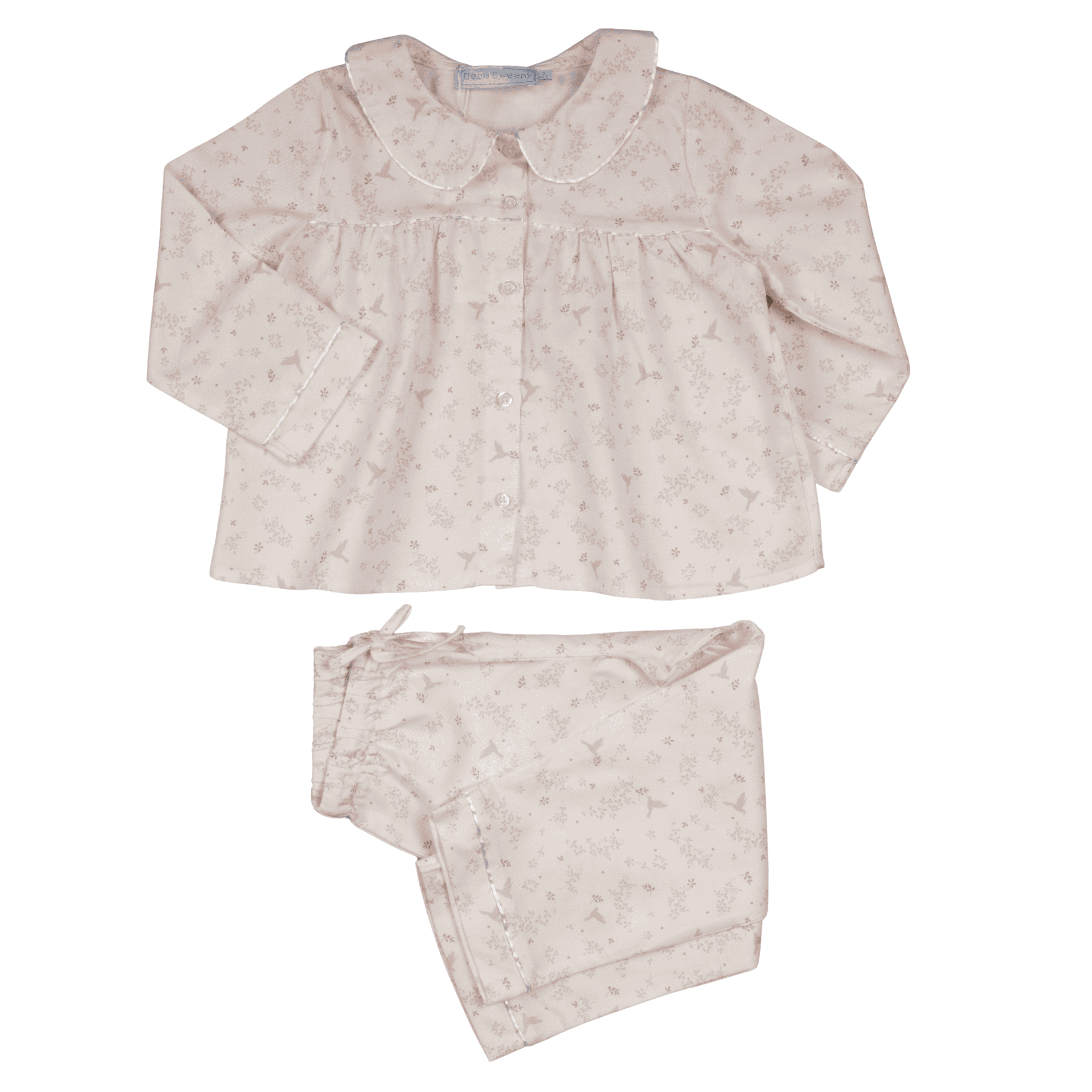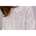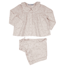 Girls ivory cotton two-piece set, with a sweet pink floral pattern. The top has a rounded collar and button fastenings on the front, and the trousers have a drawstring waist for comfort.