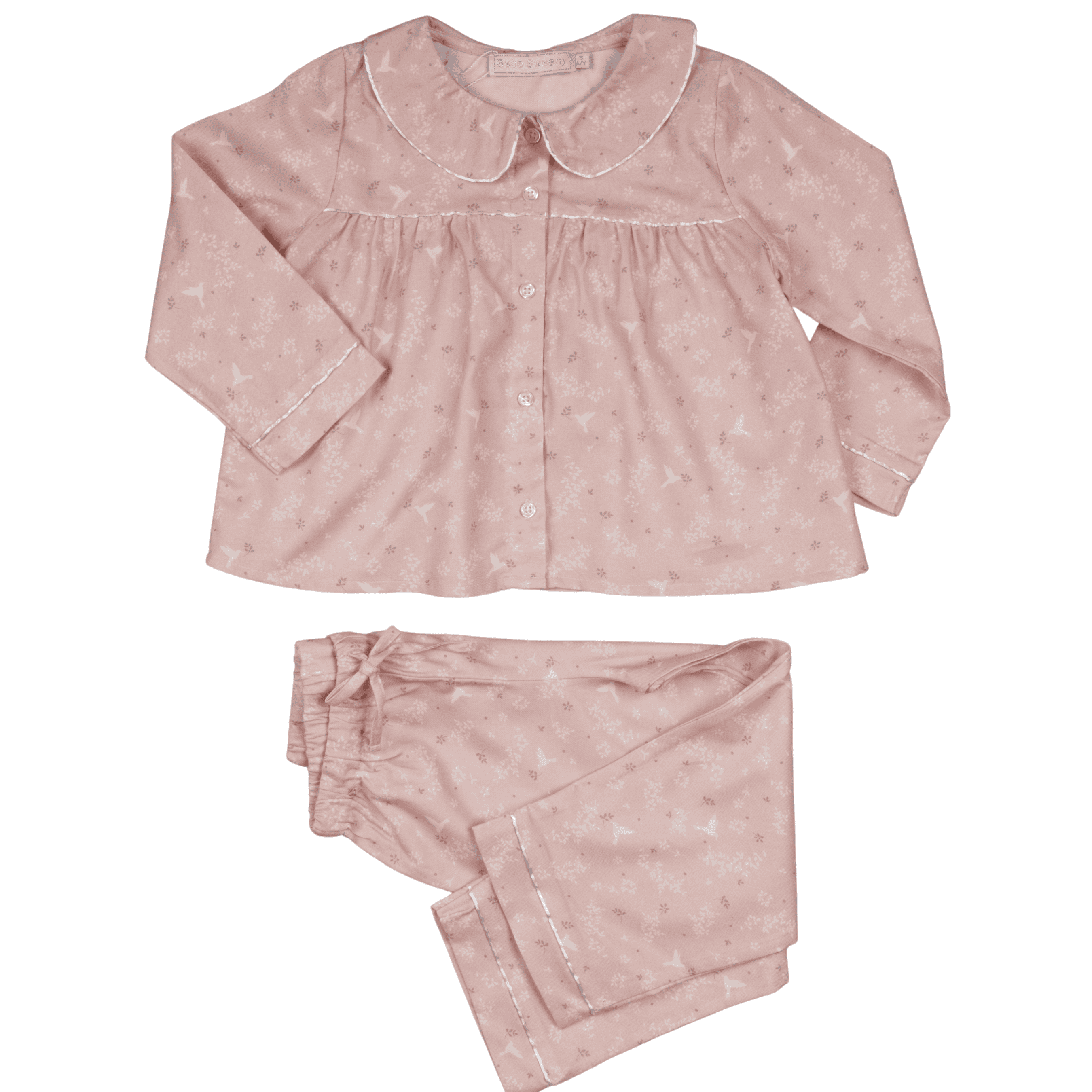 Girls pink cotton two-piece set, with a sweet pink floral pattern. The top has a rounded collar and button fastenings on the front, and the trousers have a drawstring waist for comfort.
