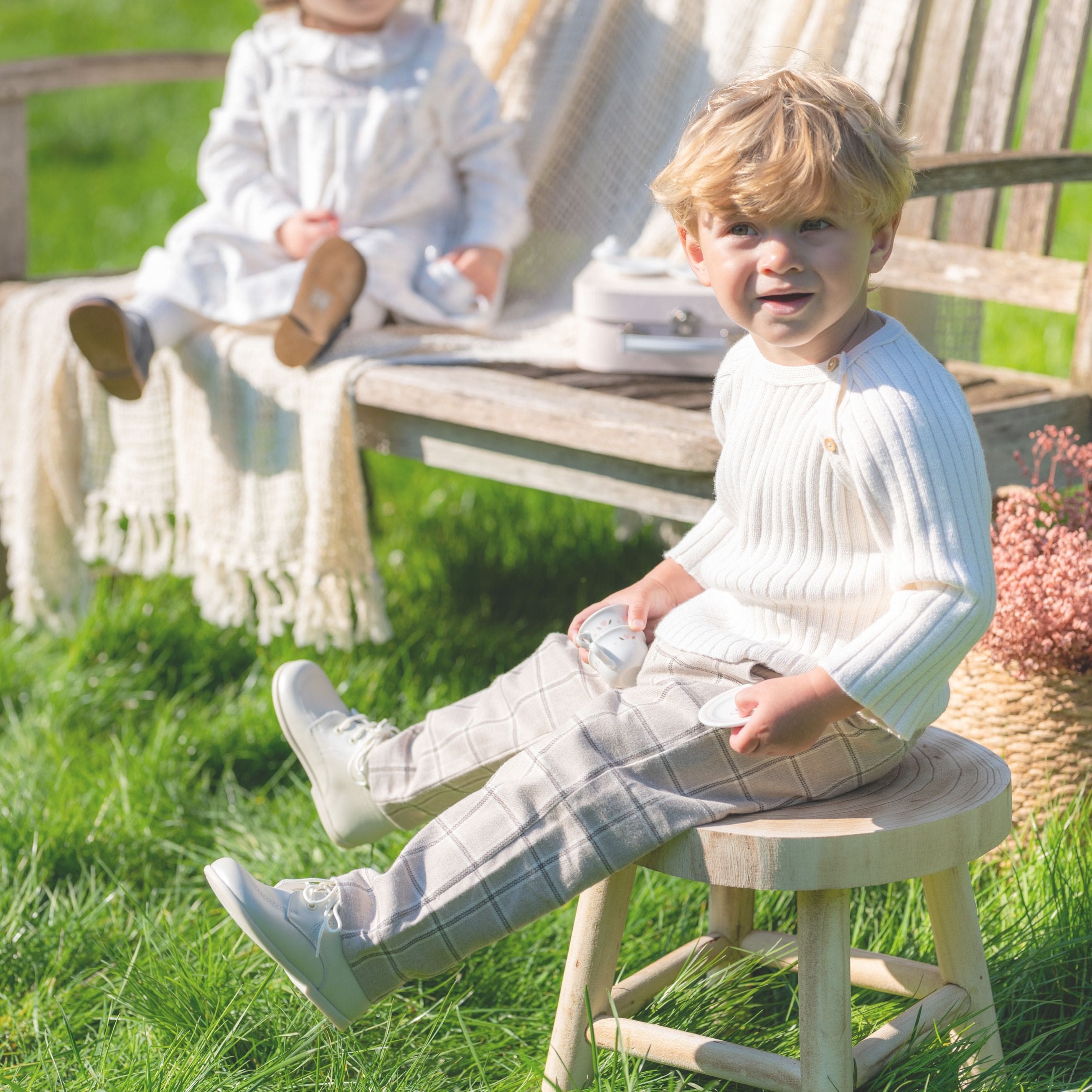 Cream sweater for boys and girls. Super comfortable to wear, it is knitted in an extra soft wool blend. Easily fastening with natural beige wooden buttons on the side. Matching hat, booties and blanket are available in the same collection.