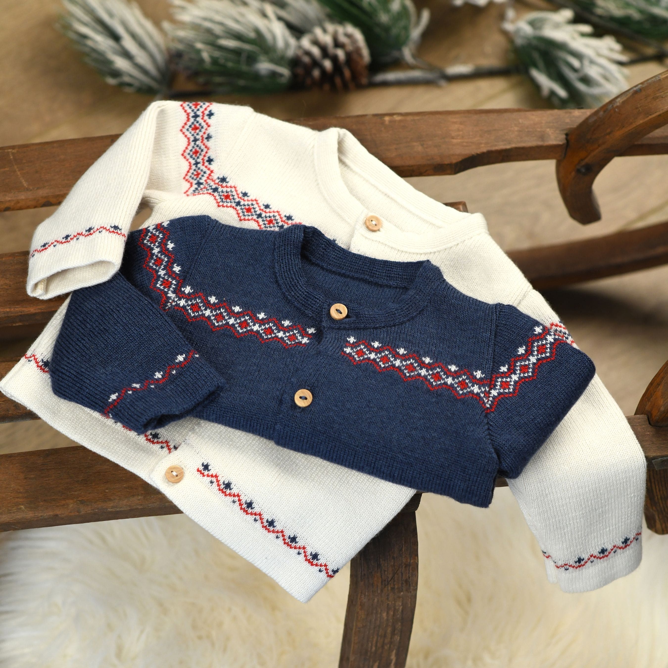 Navy blue knitted cardigan for baby boys made in a luxuriously soft wool blend. This cosy lightweight knit features a charming red and ivory snowflake detailing on the front and cuffs. This cardigan features a round neckline and closes securely with natural wooden buttons.