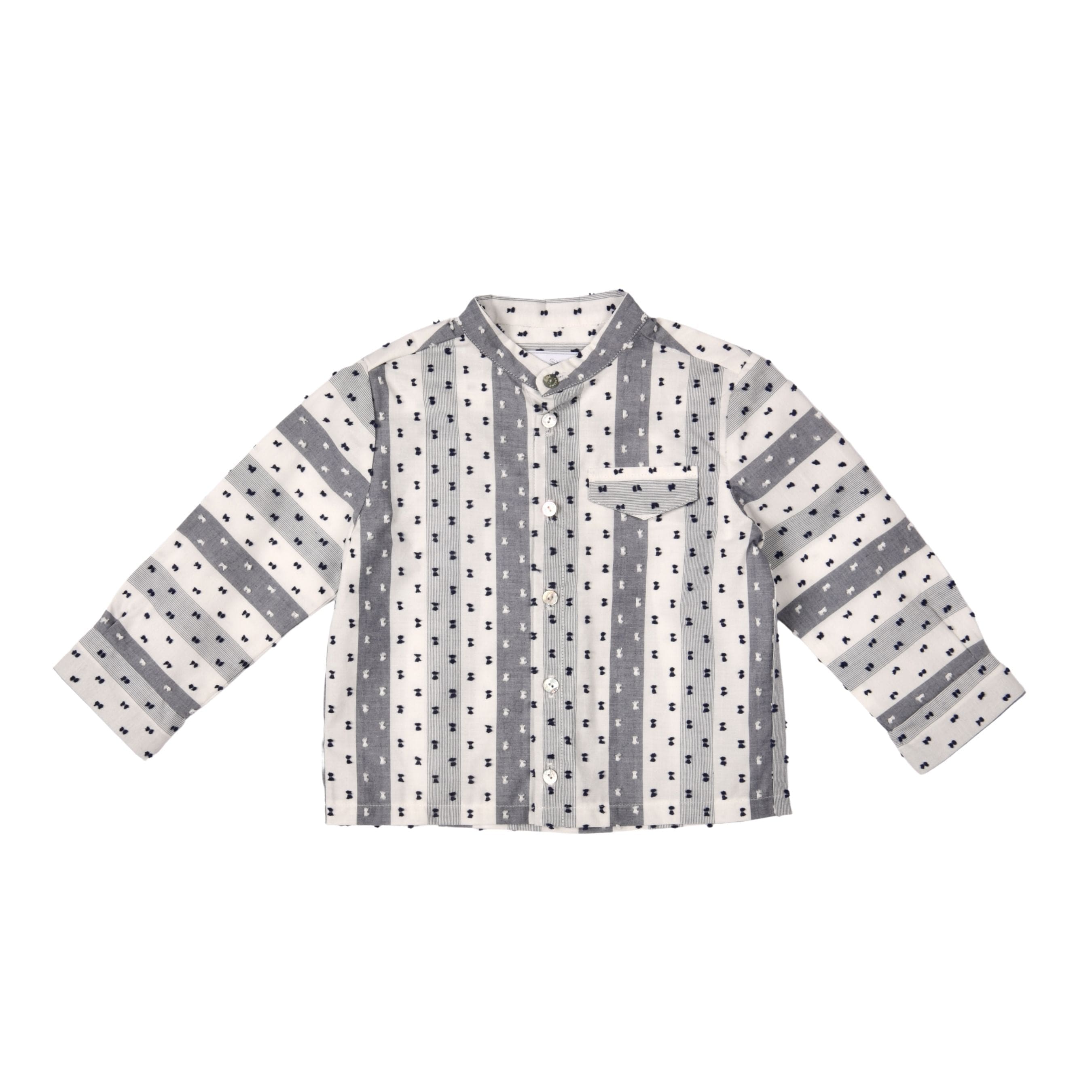 This collarless ivory and blue cotton shirt for young boys features embroidered plumetis and blue denim stripes, making it a stylish choice for smart-casual occasions. Its lightweight and soft fabric, along with a half placket and front button fastenings, add to its charm and comfort.