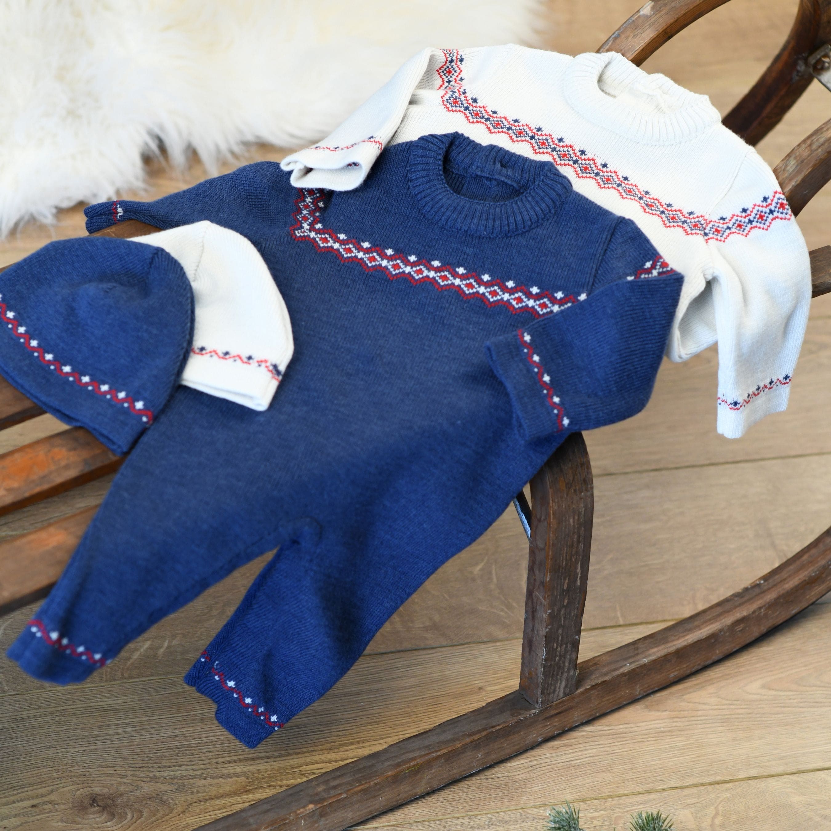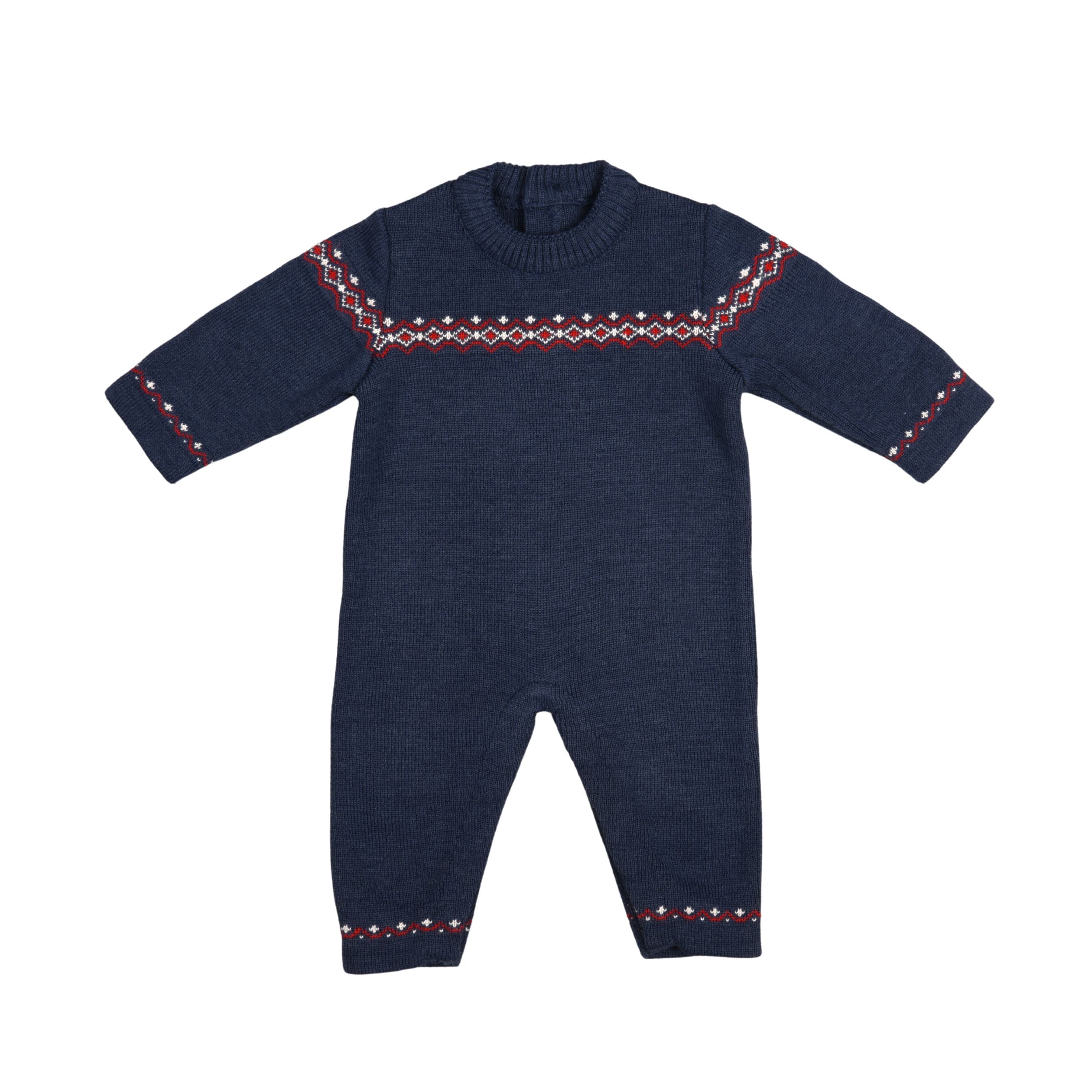 Navy blue knitted romper for baby boys made in a luxuriously soft wool blend. This cosy lightweight knit features a charming red and ivory snowflake detailing on the front and cuffs. There are buttons on the back and practical poppers between the legs for easy dressing.