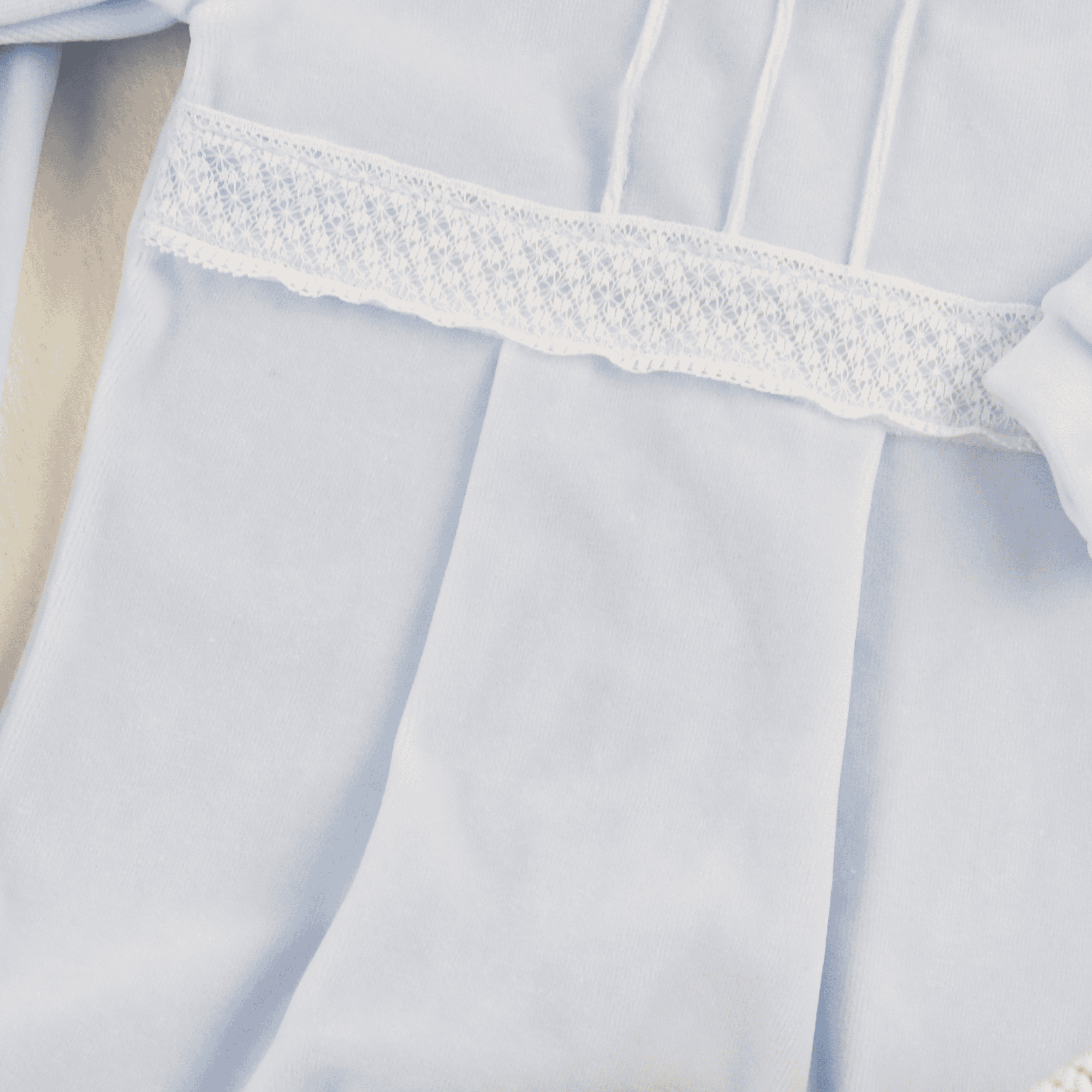 Pretty blue gown for baby boys, made in super soft cotton velour. Gentle against delicate skin, this traditional babysuit has a charming white lace detailing on the front and cuffs. There are easy popper fastenings on one side and the hem is gently elasticated.