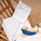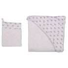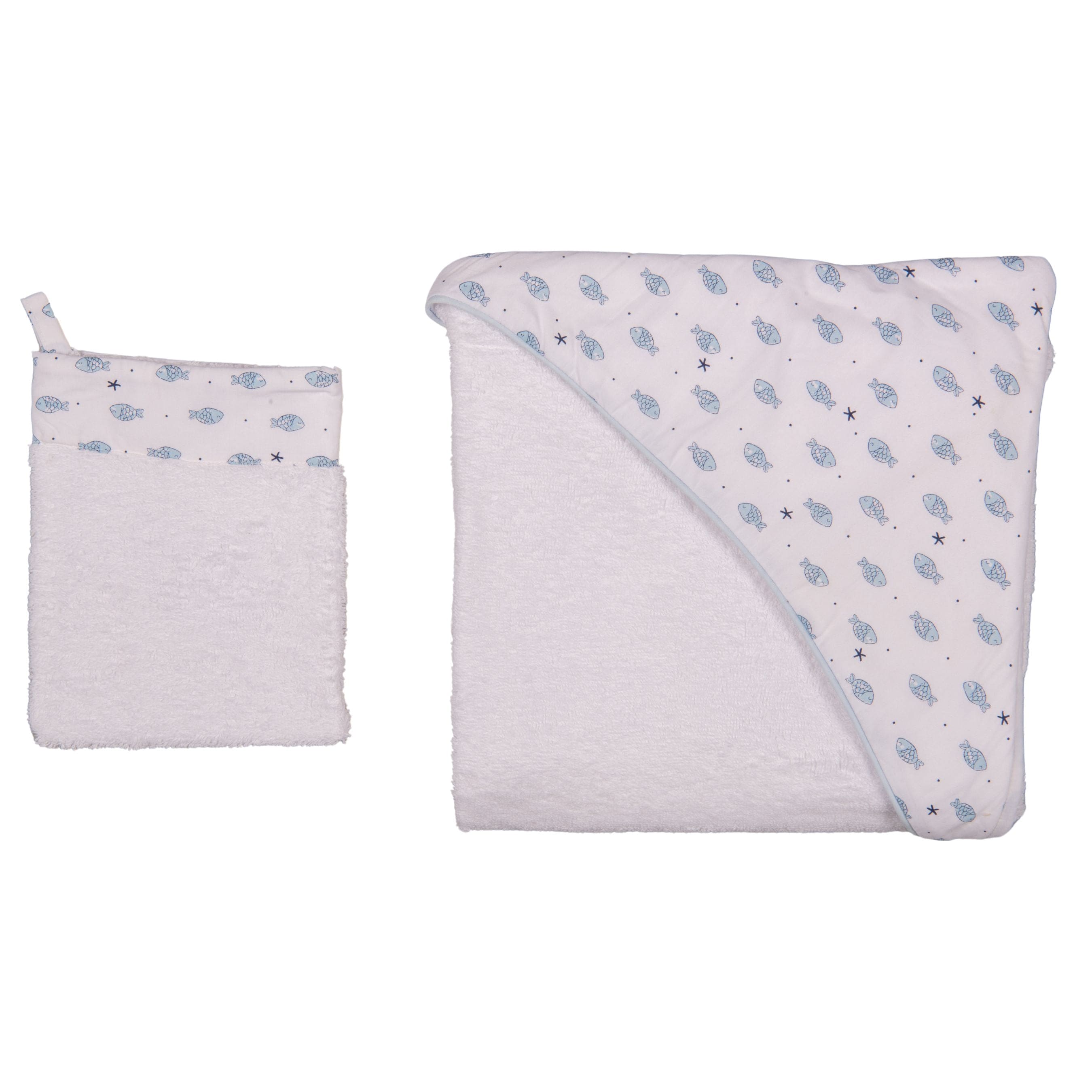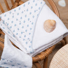 This hooded baby towel is made from high-quality, dense cotton towelling, featuring a charming blue fish print design on the edges and hood. With a soft and absorbent texture, this towel is perfect for drying off your little one. The addition of blue piping adds a touch of sophistication.