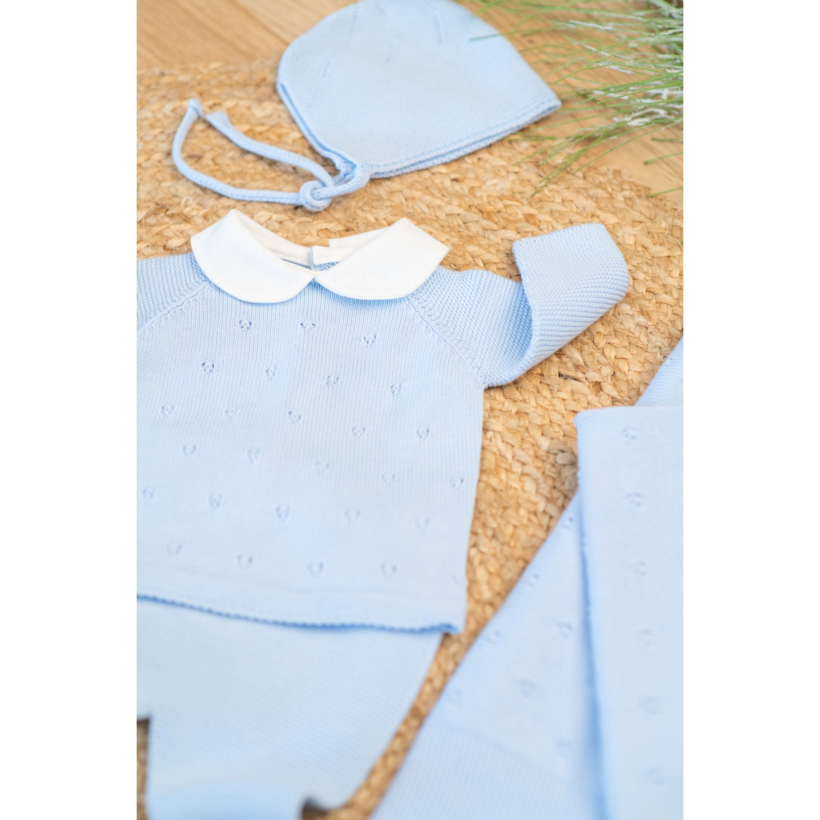 Made from luxurious cotton yarn, this charming blue knit set is perfect for baby boys. The top features a classic white twill Peter Pan collar and convenient back button fastenings, while the matching trousers have a gently elasticated ribbed waistband. Complete with a cozy beanie hat and soft blanket, this four-piece set is the ideal take-home ensemble. Comes in our signature gift box.