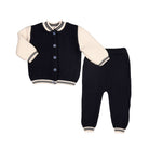 Navy blue and ivory trouser set for little boys knitted in a lovely garter stitch for a warm and cosy feel. Made in soft cotton blend, the set includes a navy blue bomber-style with ivory and navy blue striped ribbed trims and button fastenings. The matching trousers are elasticated on the waist for a comfortable fit and feel.