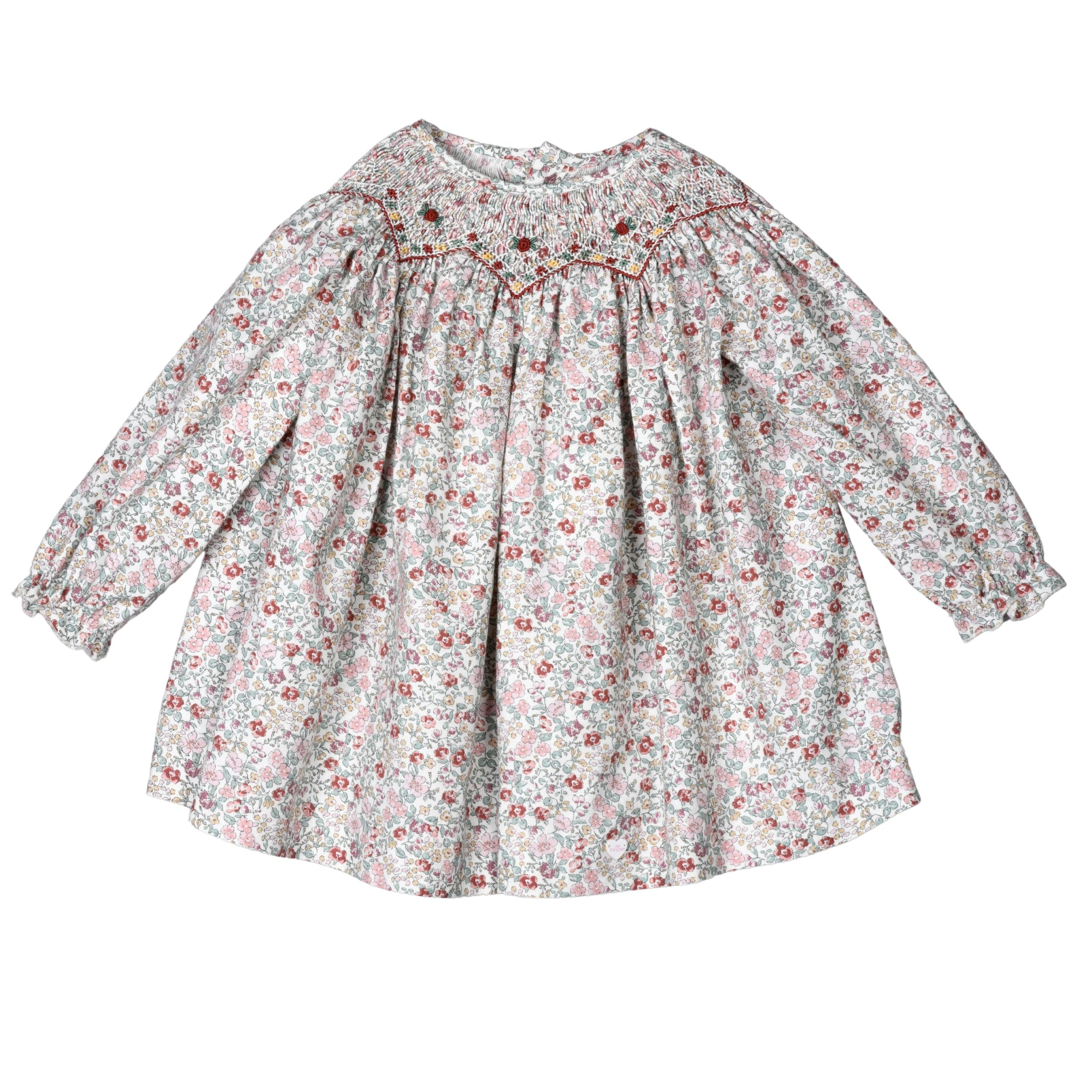 Pink floral dress for baby girls woven in soft cotton fabric. Worn on its own or paired with tights, this lovely design has a hand-smocked panel below the neckline and across the shoulders. This is finished with pretty floral embroidery in burgundy, mustard yellow and green which complements the delicate detailing on the chest. The dress is fully lined with cotton and fastens on the back with buttons.