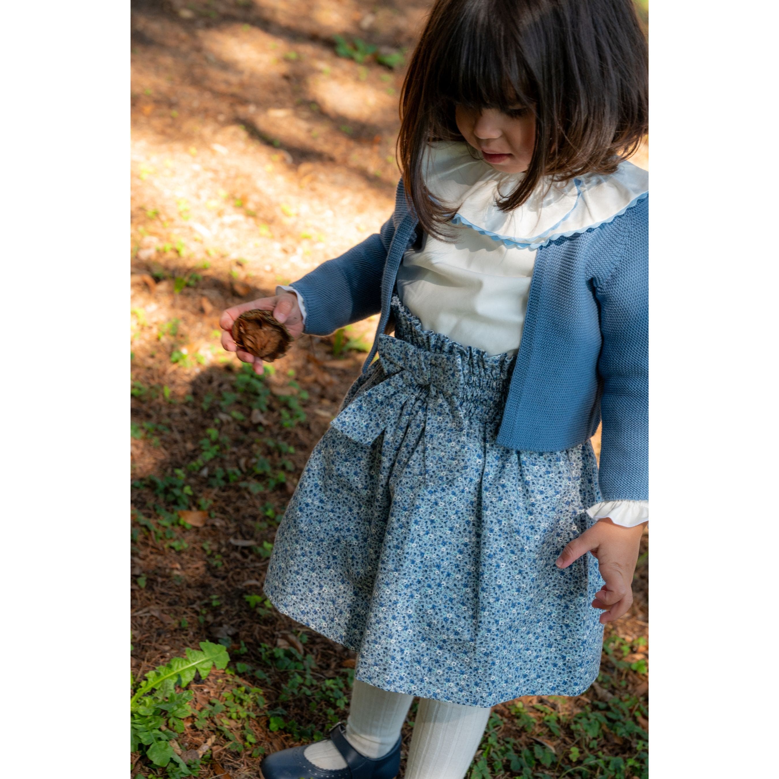 This charming cotton skirt for girls features a beautiful ivory, navy blue, and light blue floral pattern. Adorned with a decorative front bow, it also boasts a smocked waistband to ensure a comfortable fit. Pair it with our Colette blue cardigan and our white Eris blouse for an elegant look.