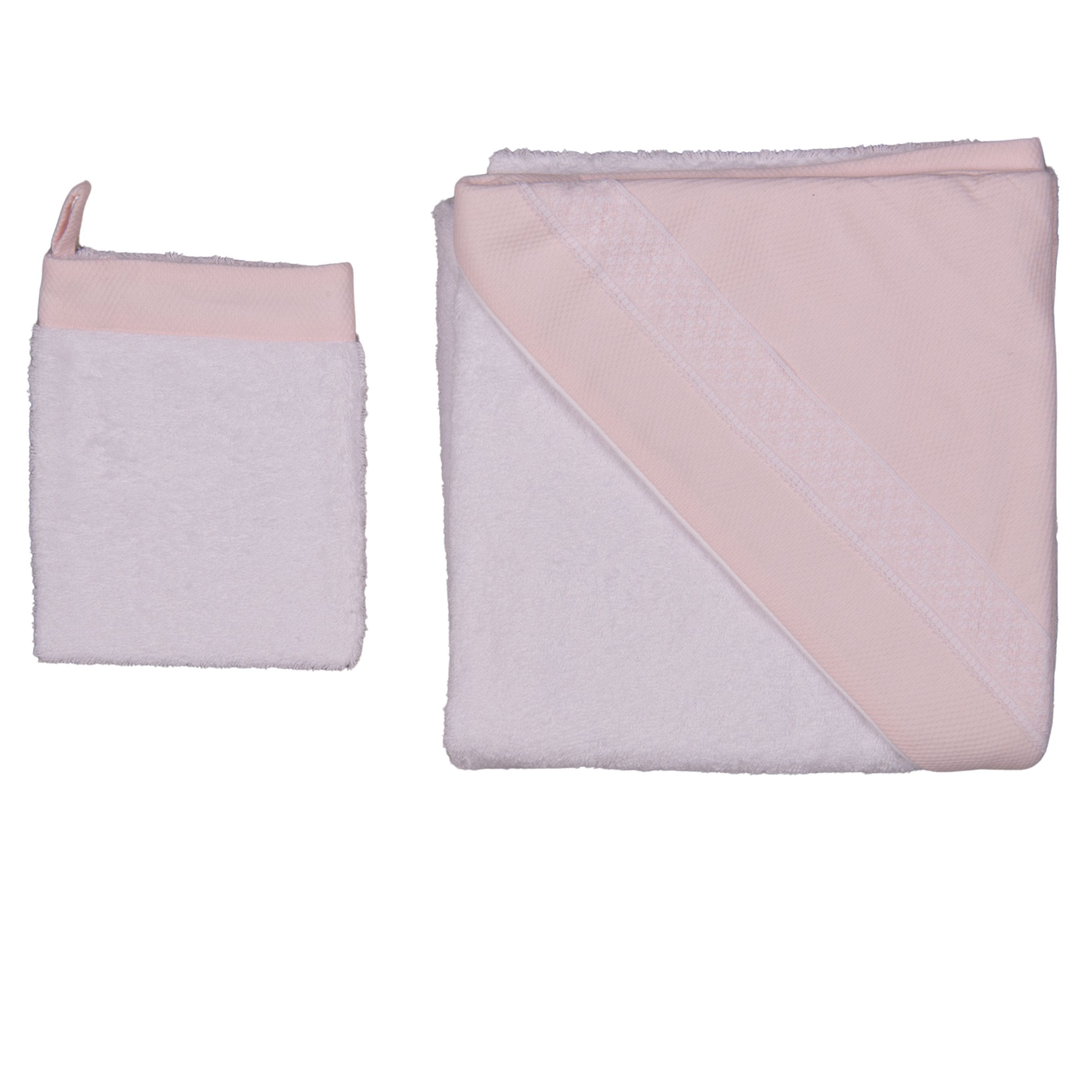 Baby girls pink terry cotton hooded towel and wash mitt set. Beautifully soft and fluffy, the cotton piqué hood has a lace detailing.