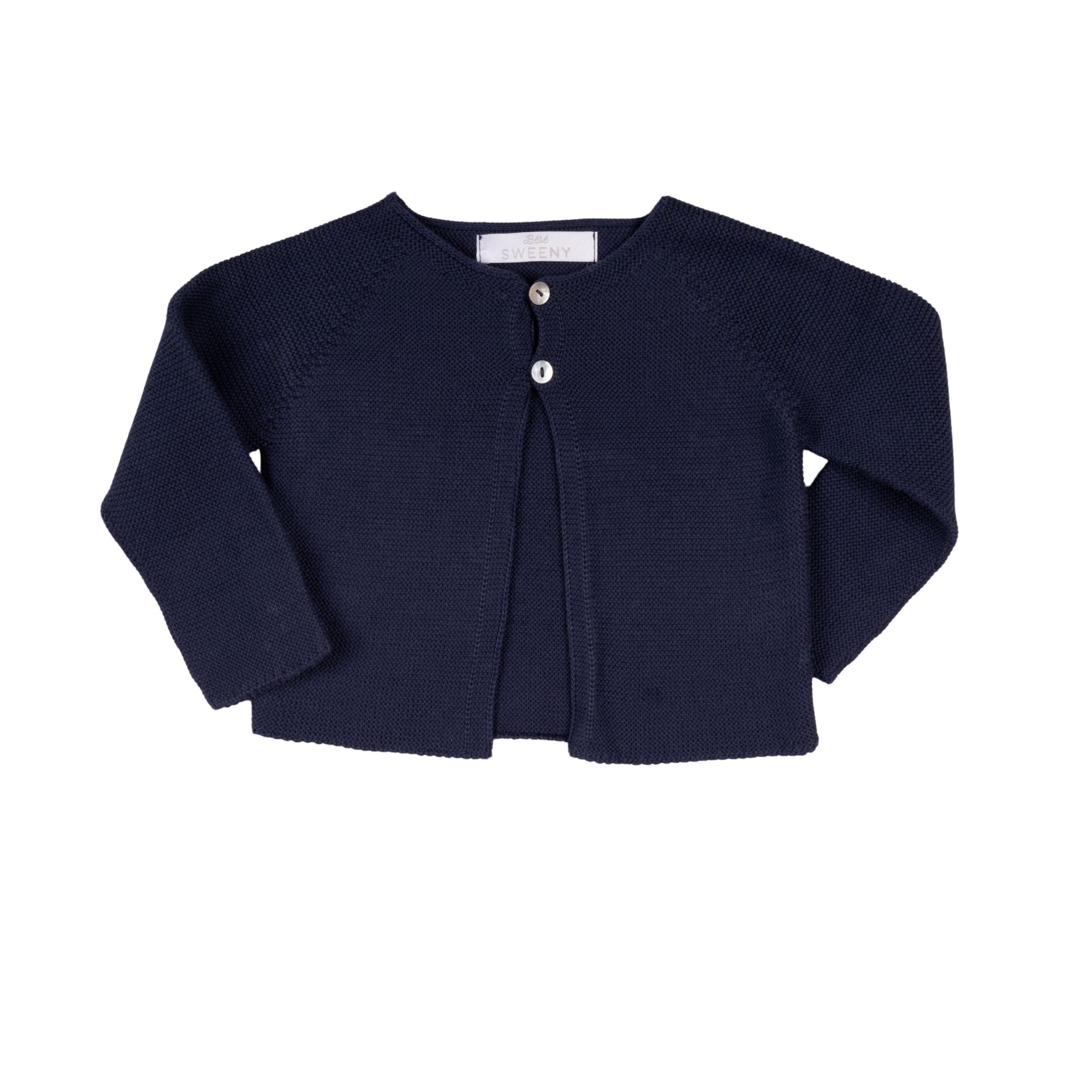 This navy blue cardigan is perfect for layering on chilly days. It is made with a soft and beautiful knitted cotton that sits neatly at the waist. The round-neck style features two mother-of-pearl buttons on the neckline for a simple and elegant touch.