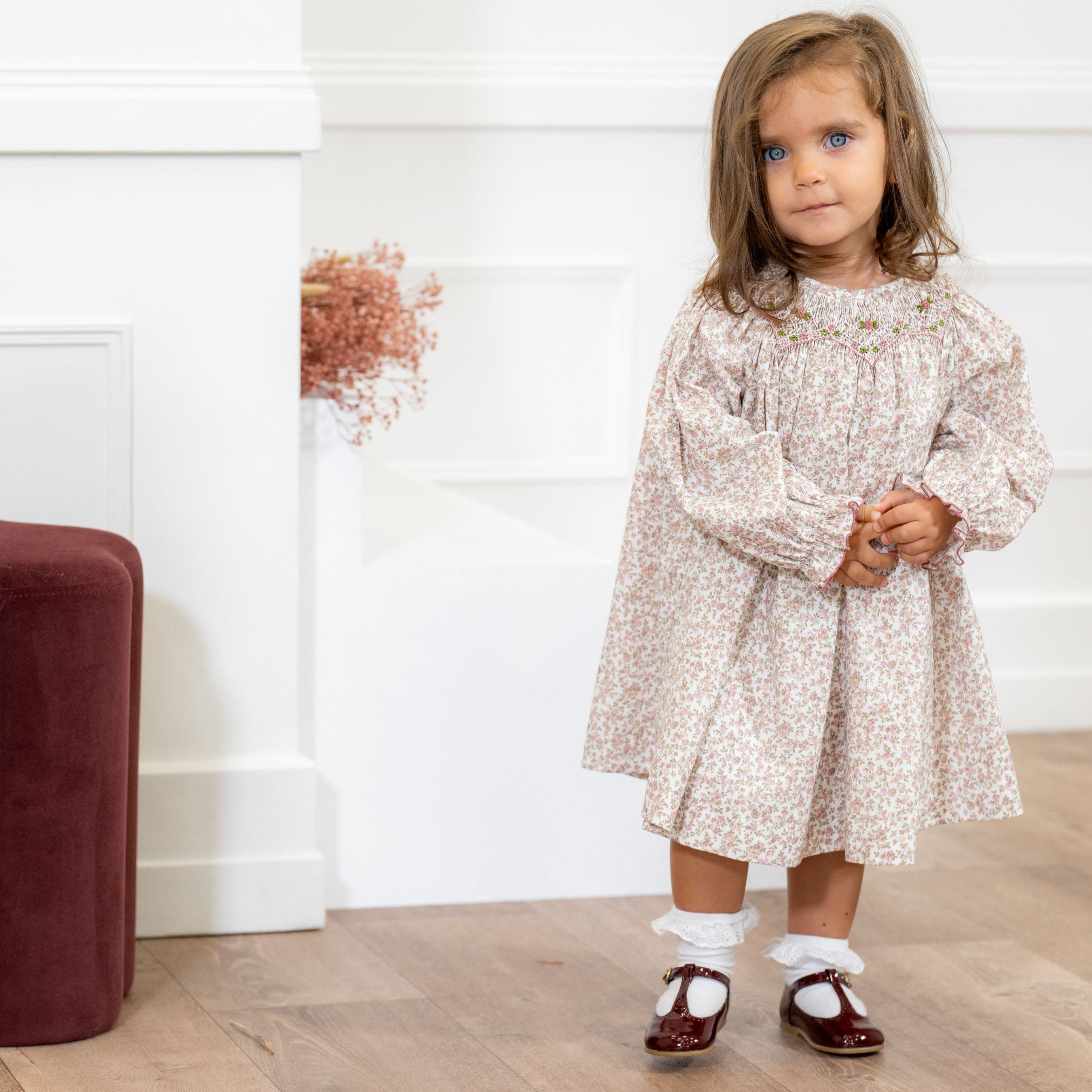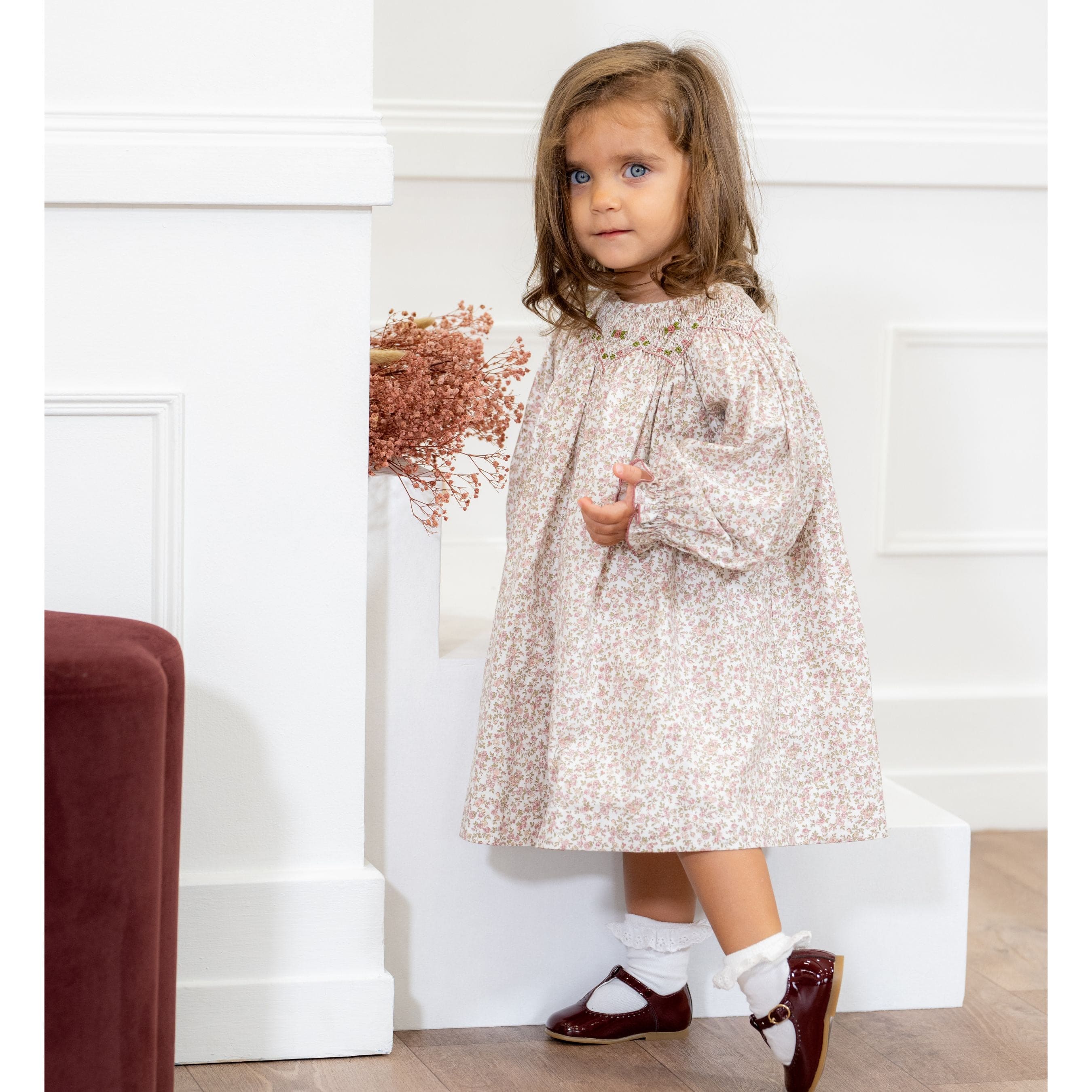 This beige and pink cotton dress for young girls features a charming floral pattern. Lightweight and comfortable, it showcases a finely embroidered, hand-smocked neckline that adds a classic touch. Perfect for Autumn outfits, the dress is fully lined and closes with button fastening on the back for ease of wear.