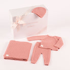 Baby girls gorgeous terracotta trousers set. Super soft and comfortable, the sweater fastens on the side with natural beige wooden buttons. The matching trousers are full length and have an elasticated waistband. Complete the set with the matching hat and blanket available in the same collection.