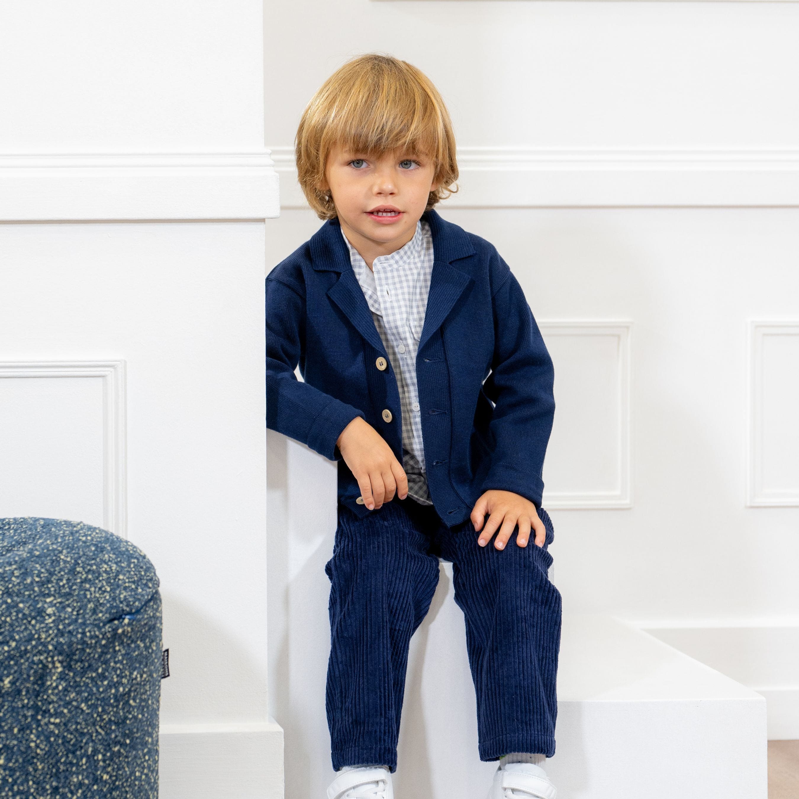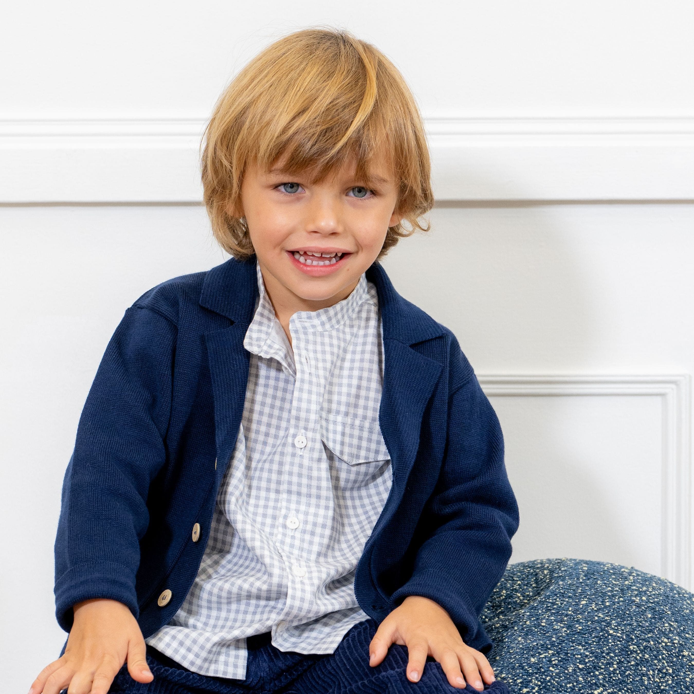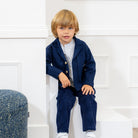 A navy blue cardigan for little boys finely knitted in a soft cotton. Both comfortable and stylish, this smart layering piece has a lapel collar and neat button fastenings.