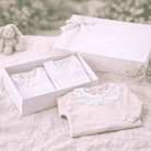 This rose nude and white newborn set is designed to offer both elegance and comfort from the very first days. The set includes two bodysuits — one in white and one in rose nude — along with a matching pair of white leggings. Crafted in soft jersey, each bodysuit features a delicate white lace collar and long sleeves finished with refined lace trim, creating a timeless and sophisticated look.
