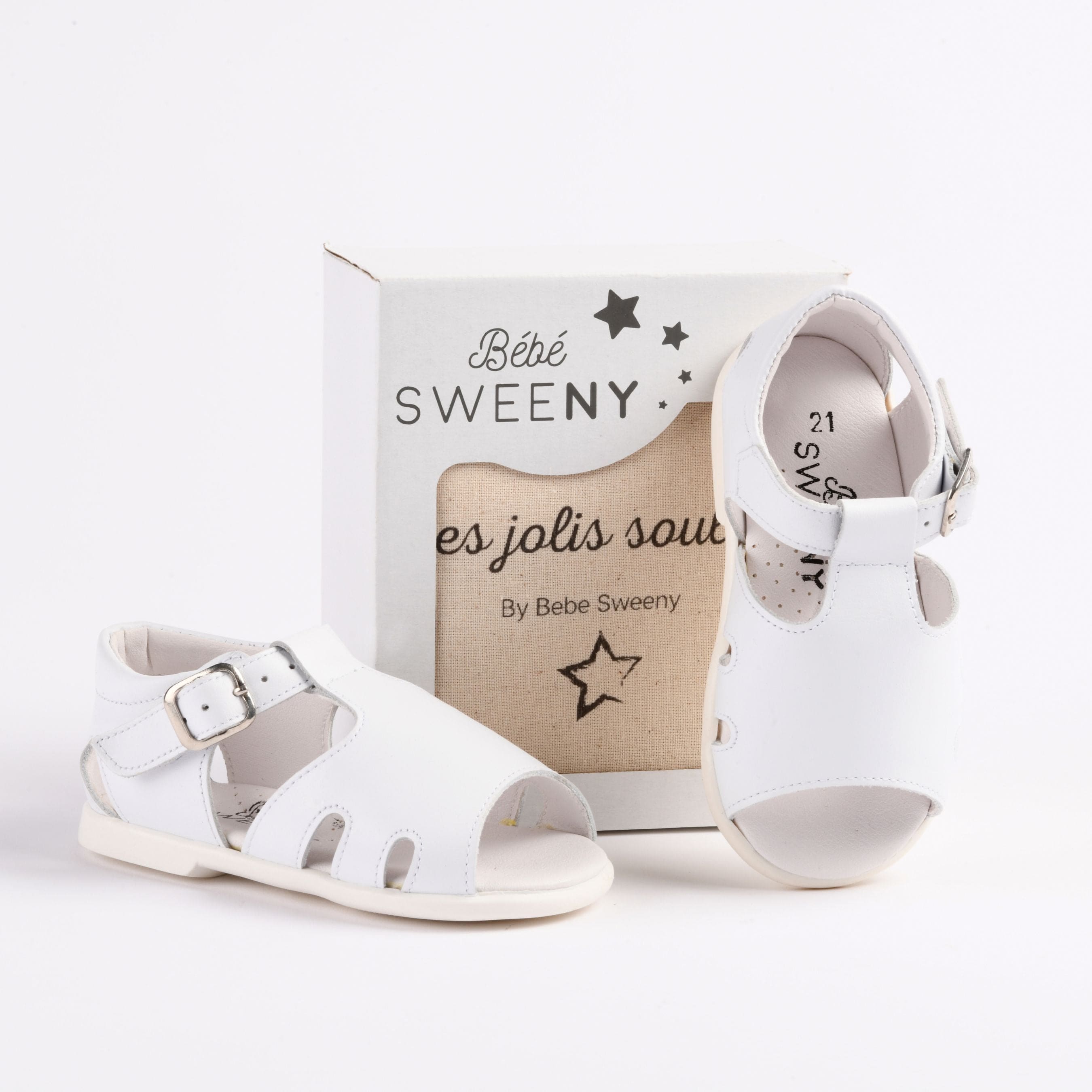 These T-bar walker sandals feature a side strap with an adjustable metal buckle, ensuring a secure fit while making them easy to put on. Crafted in smooth white leather, this open design is ideal for warmer days, offering breathability while maintaining an elegant and refined look. Designed for first steps, the flexible yet supportive sole provides stability and comfort for little walkers.