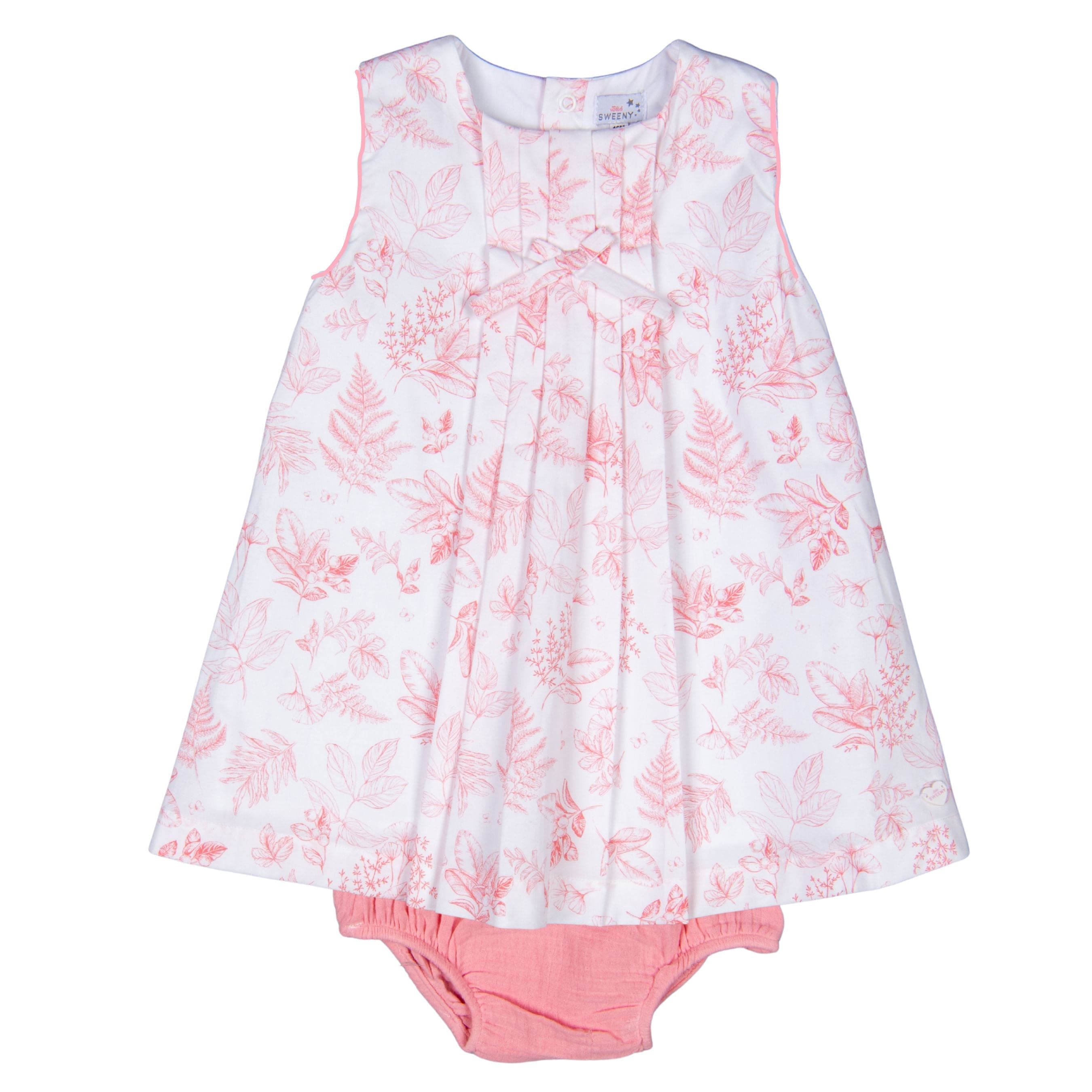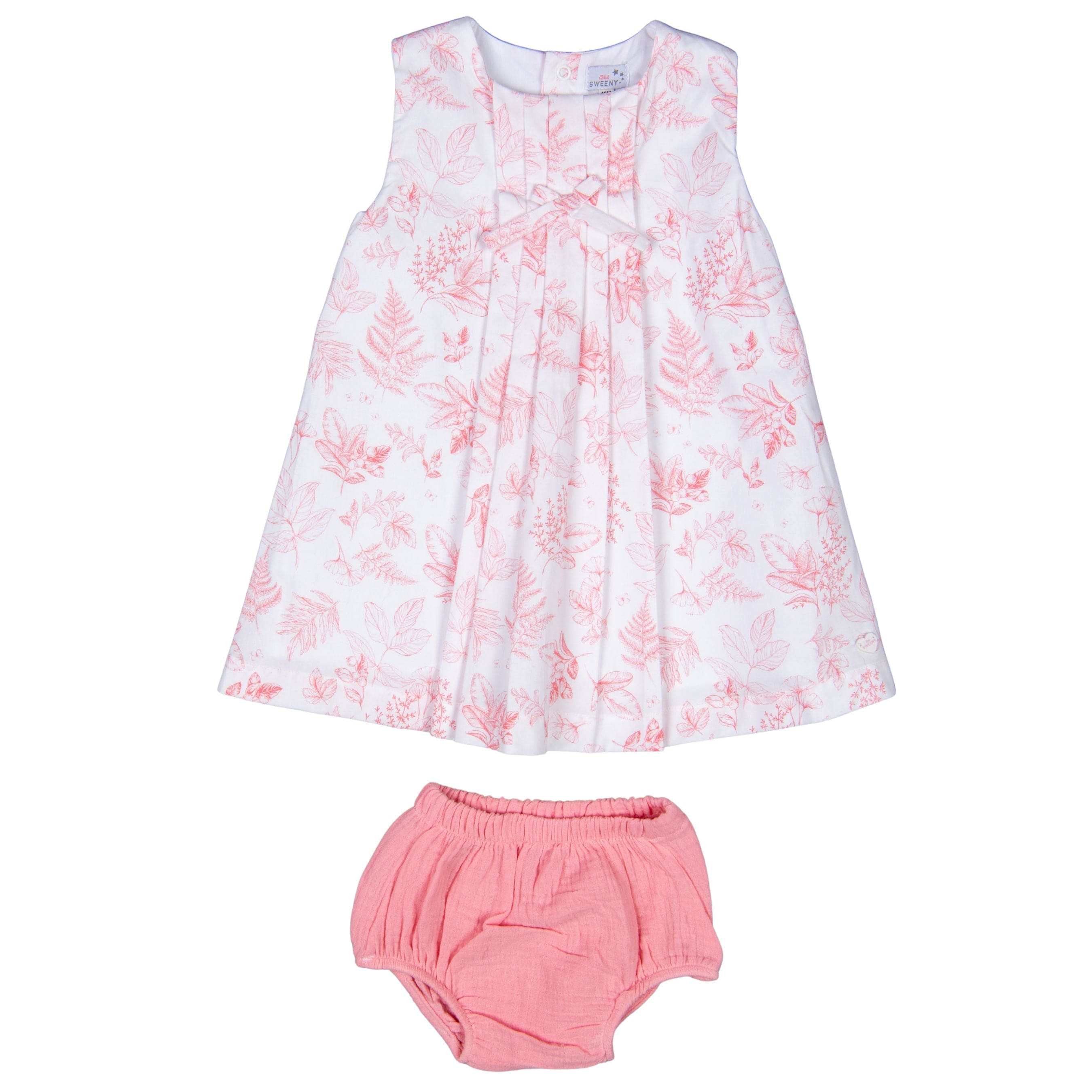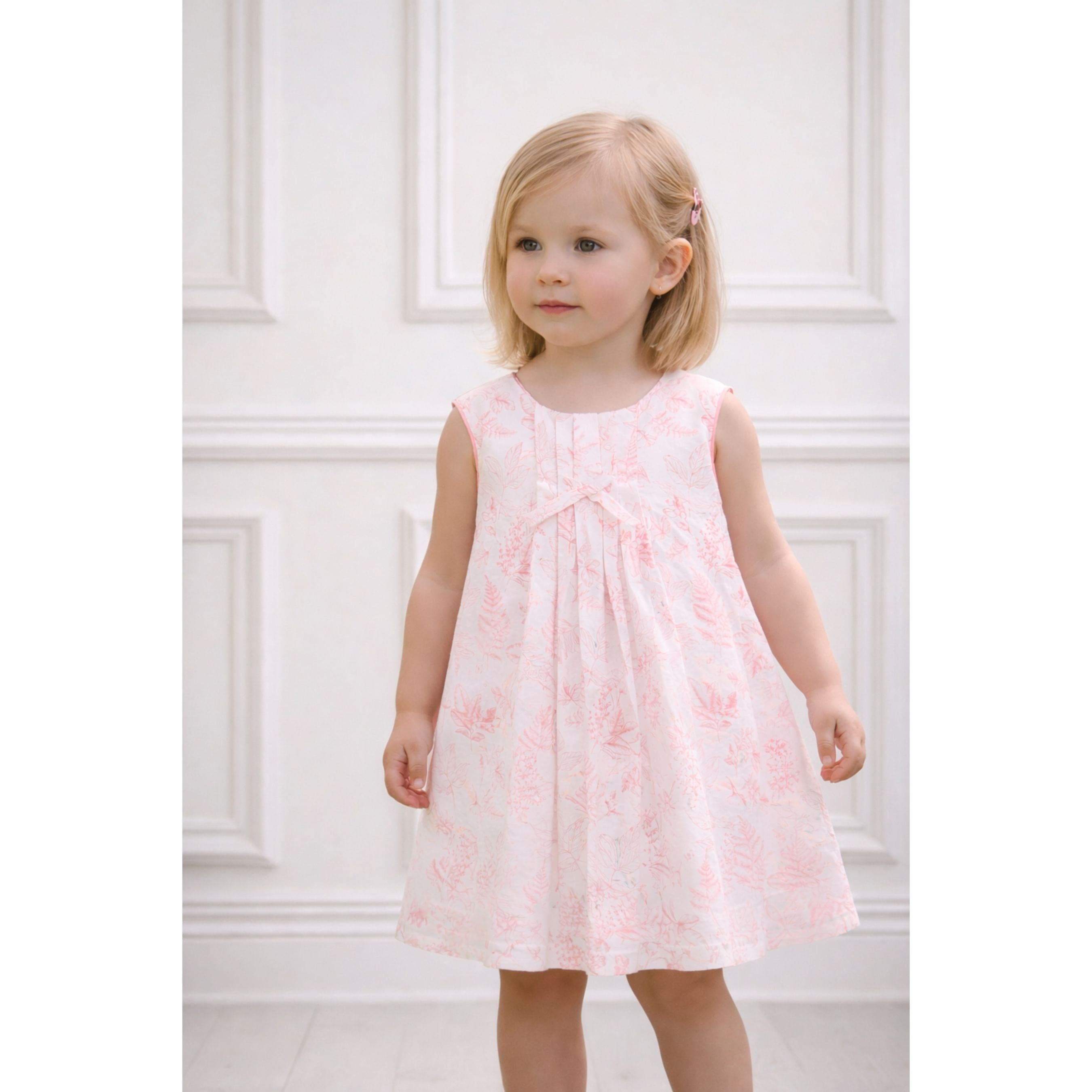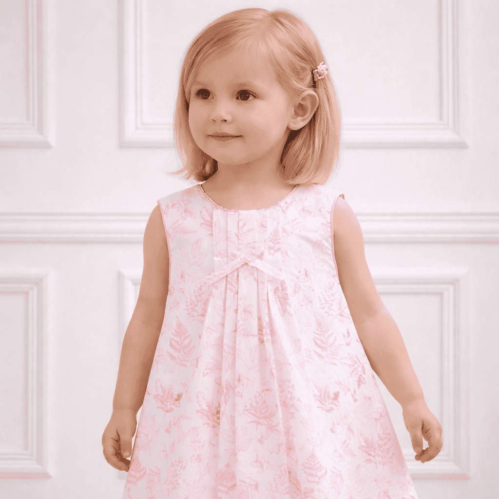 This Toile De Jouy dress and bloomer set highlights a refined pink botanical print inspired by classic French heritage. The elegant pattern, delicately drawn on a soft white background, brings a timeless and sophisticated touch to this summer outfit. Lightweight and comfortable, it is designed for warm days while maintaining a polished silhouette with its pleats and bow detail.