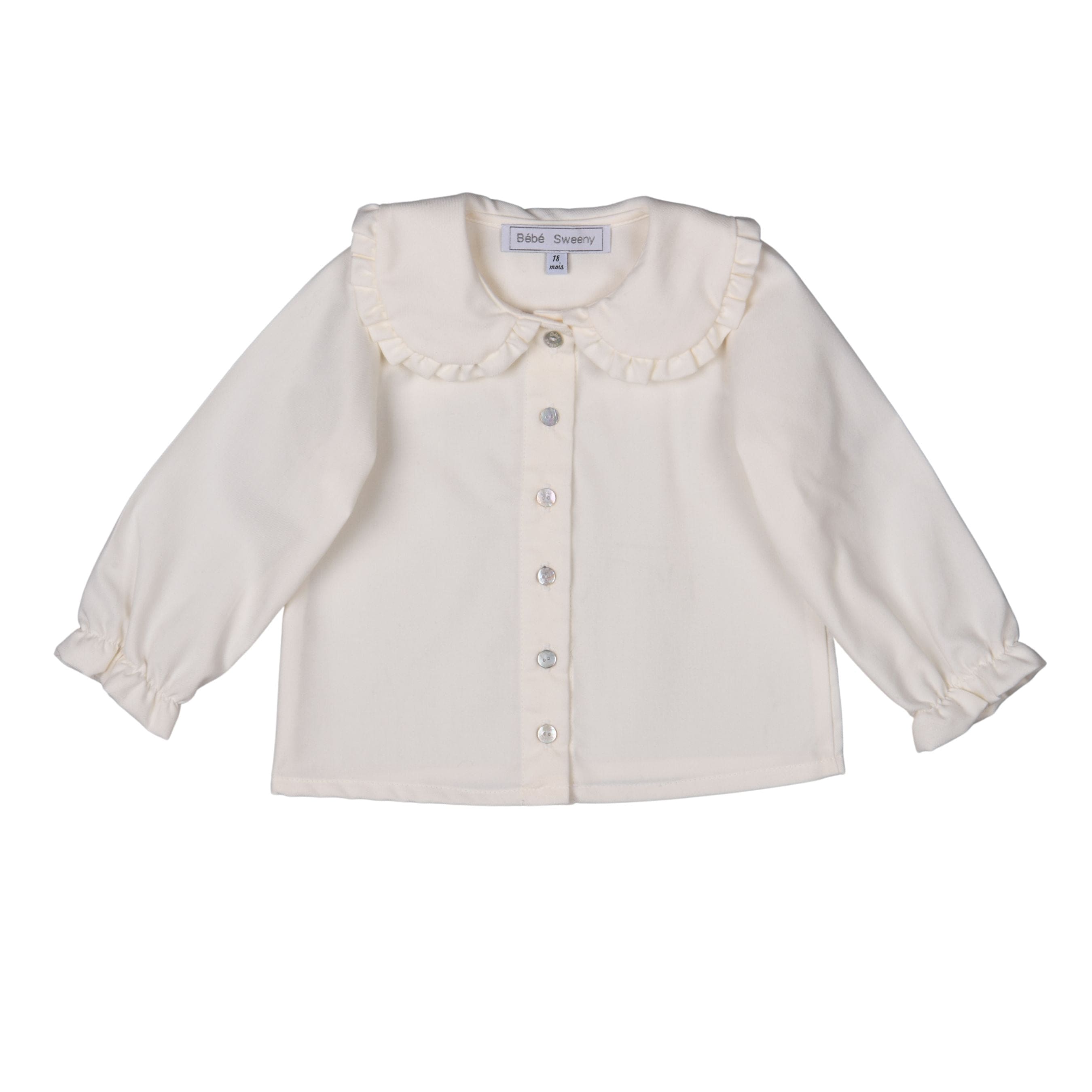 Cream twill collared blouse for girls. Carefully crafted from a soft cotton blend, this blouse features a front button closure and a loose, flowy fit. The charming collar is adorned with a frilly cream border and elasticated cuffs add a touch of elegance.