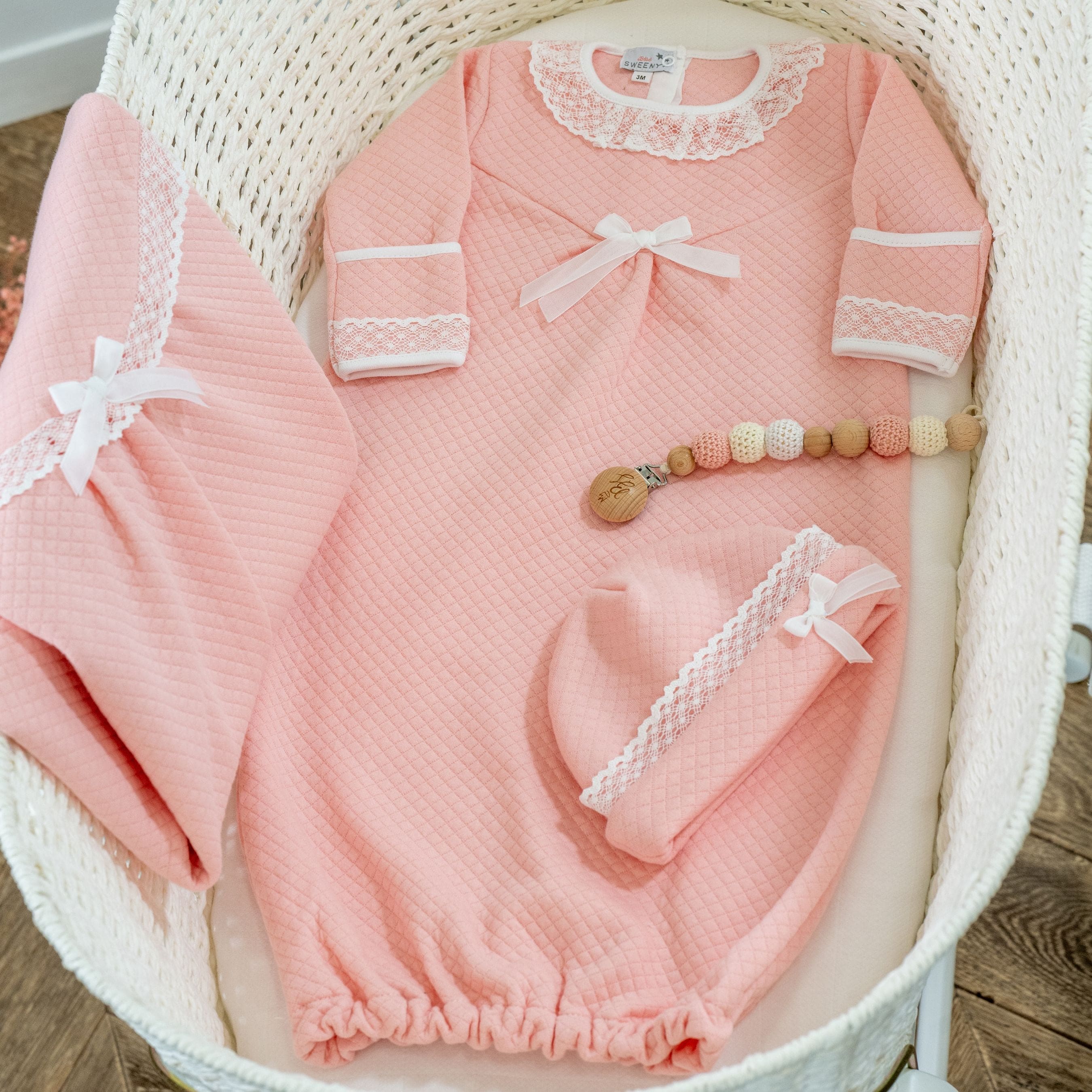 A timeless baby essential designed with delicate details and exceptional softness. The Nola baby blanket is crafted in soft quilted cotton in a gentle pink shade. Its elegant envelope-style fold is finished with delicate lace trim and a small decorative bow, creating a refined and classic look. Perfect for the nursery, stroller, or as a newborn gift, this blanket combines comfort and practicality. The Nola collection also includes matching pieces, allowing you to create a coordinated and elegant set for baby.