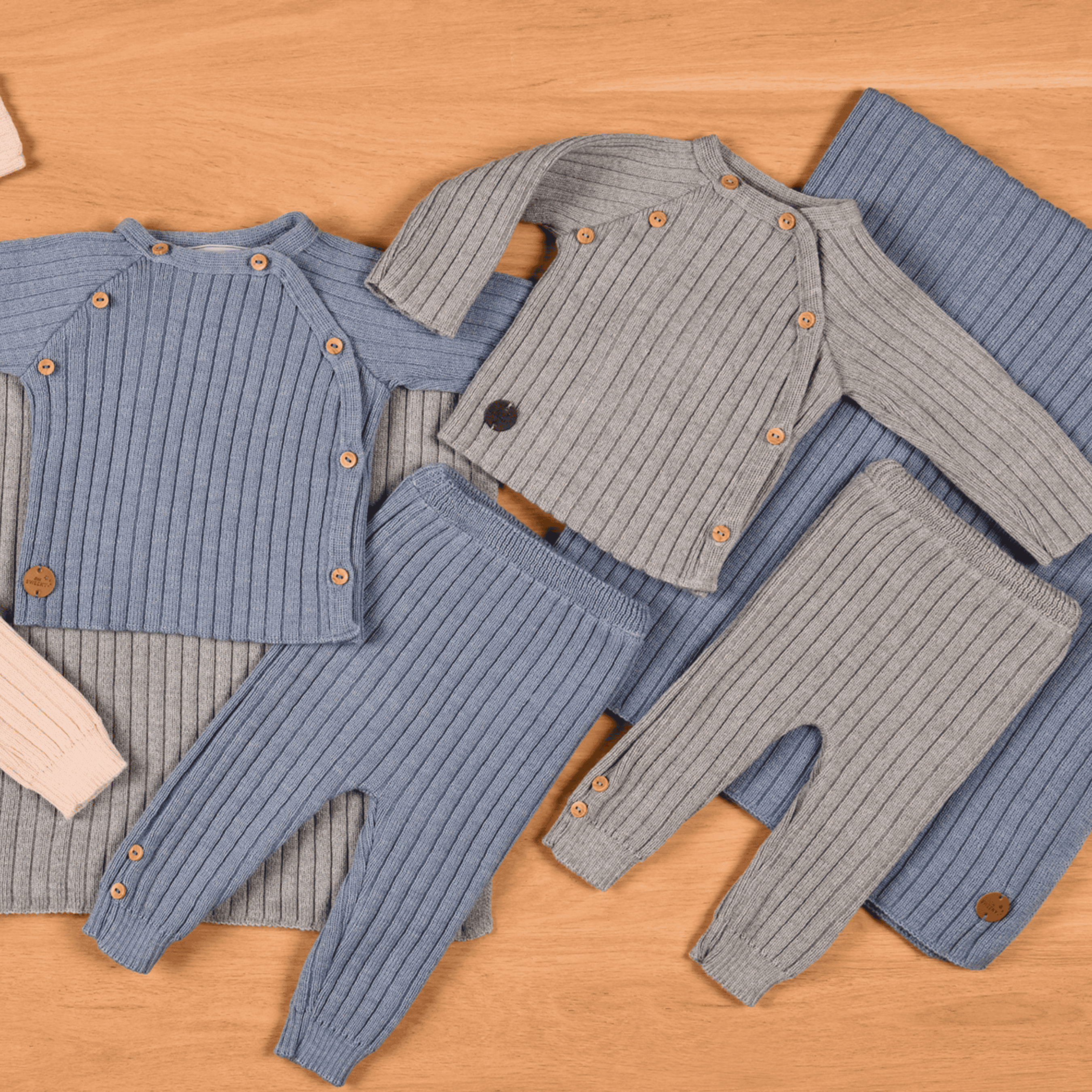 Baby boy gorgeous light grey trouser set. Super soft and comfortable, the sweater fastens on the side with natural beige wooden buttons. The matching trousers are full length and have an elasticated waistband. Complete the set with the matching hat and blanket available in the same collection.