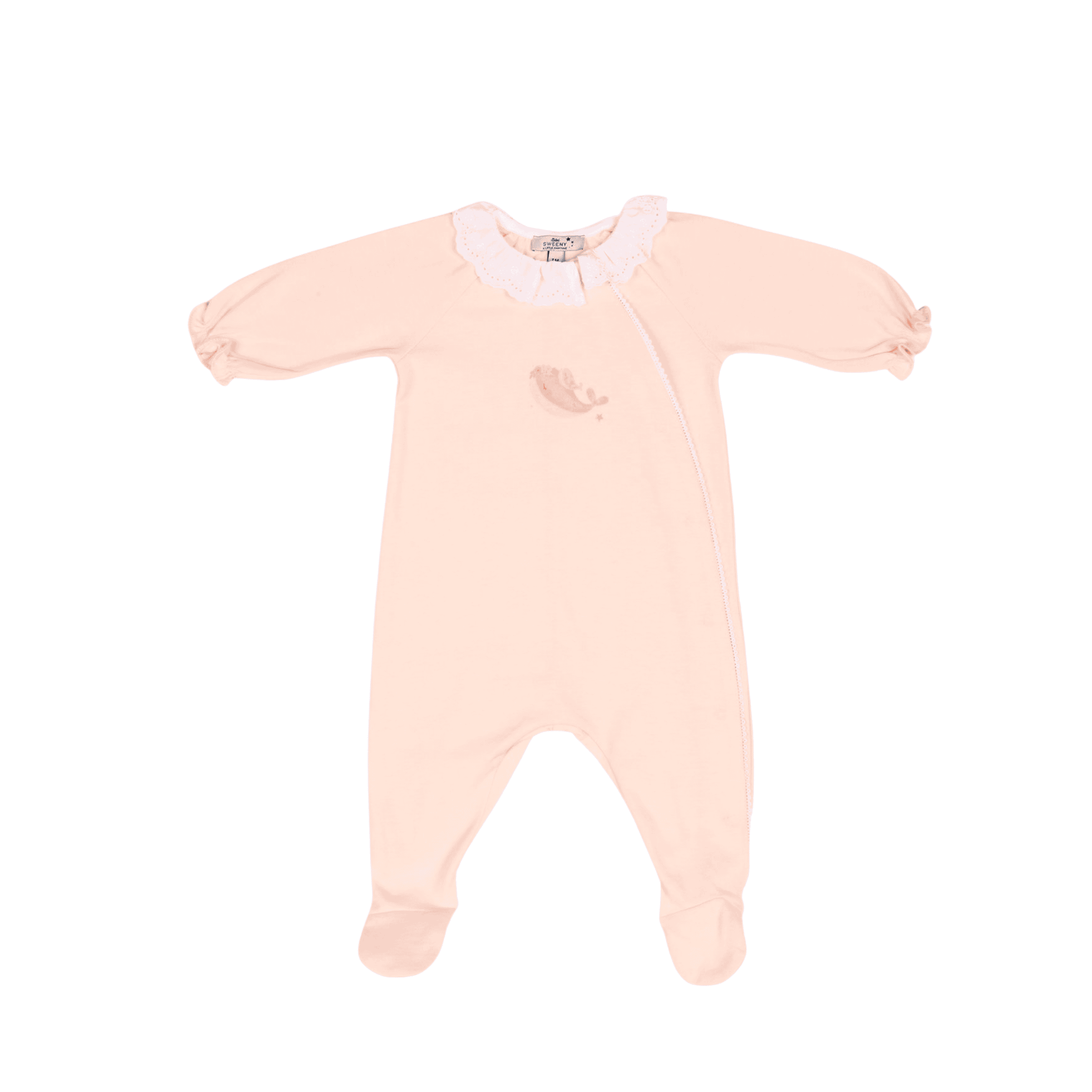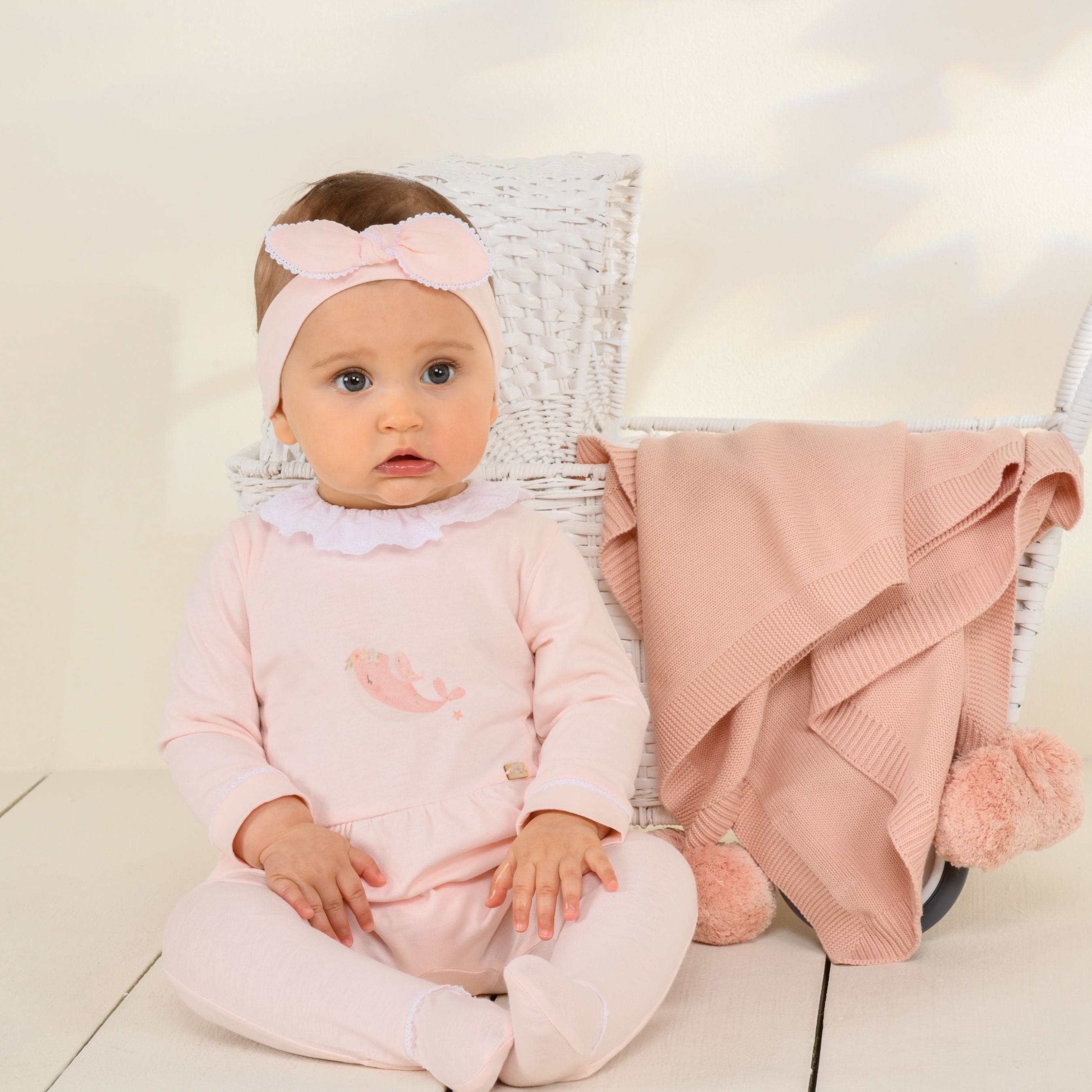 Bonito pelele para bebé niña, confeccionado en punto de algodón suave y elástico. Tiene un lindo logo impreso en el pecho de una ballena rosa y un delicado cuello de encaje.