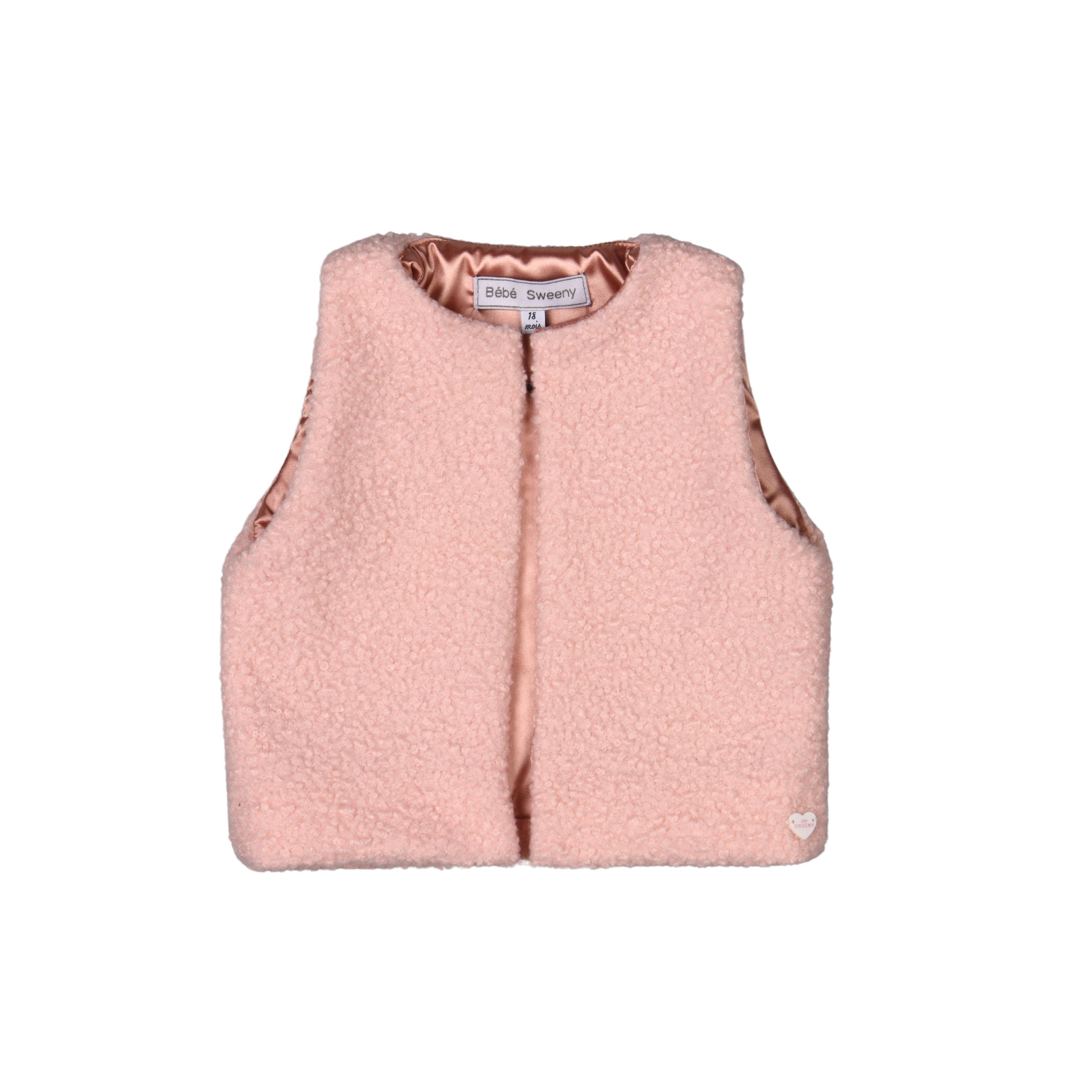 Made with plush and soft bouclé material, this pale pink gilet provides ultimate comfort for your child. Its fashion-forward design features a subtle front closure and serves as a perfect extra layer of warmth, complete with a smooth satin lining.