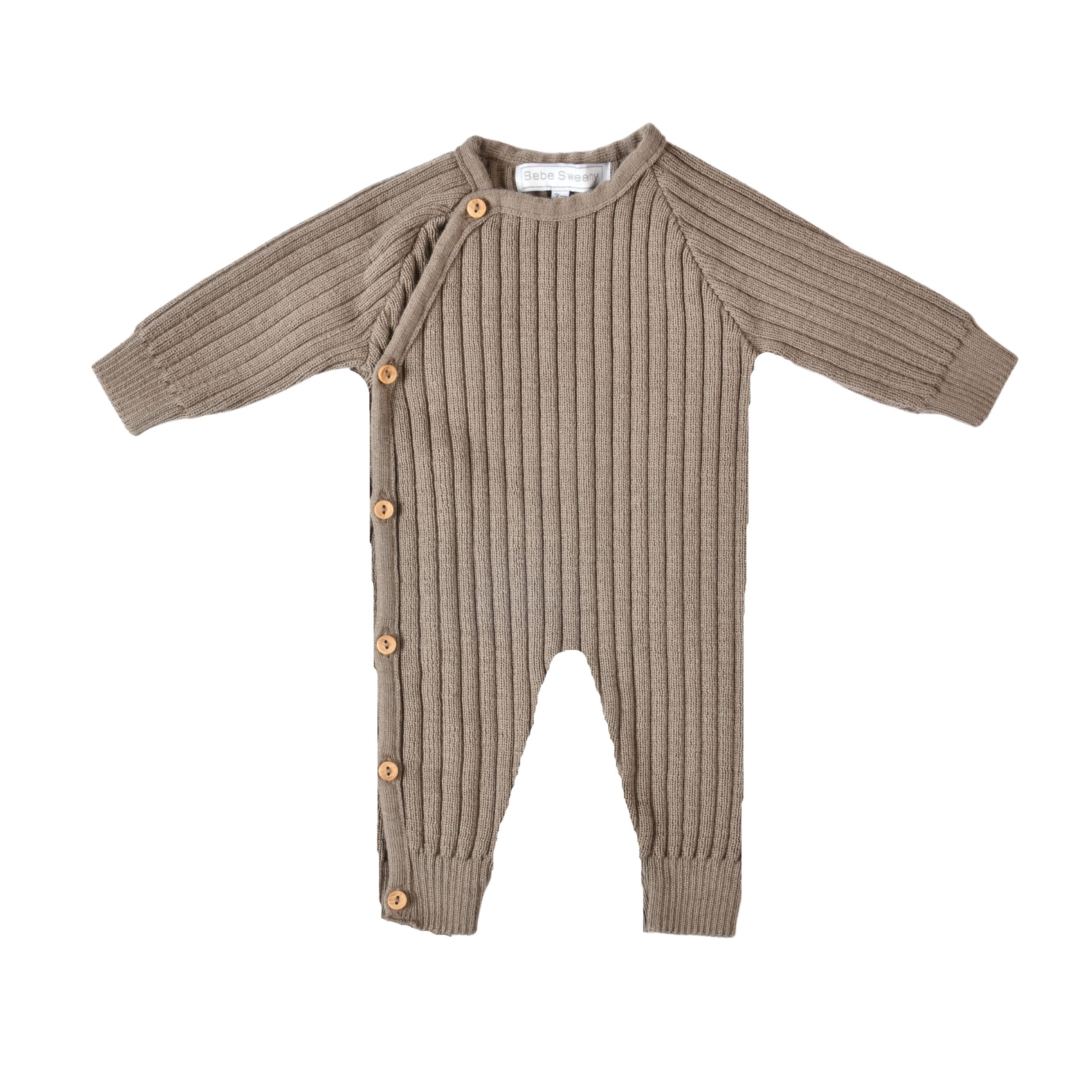 Lindo pelele de punto acanalado color topo para niño y niña, confeccionado en una mezcla de lana súper suave. Botones de madera de color beige natural con fácil cierre en el lateral. Completa este conjunto con el gorro, los botines y la manta a juego disponibles en el mismo color.