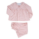 Girls pink cotton two-piece set, with a sweet pink floral pattern. The top has a rounded collar and button fastenings on the front, and the trousers have a drawstring waist for comfort.