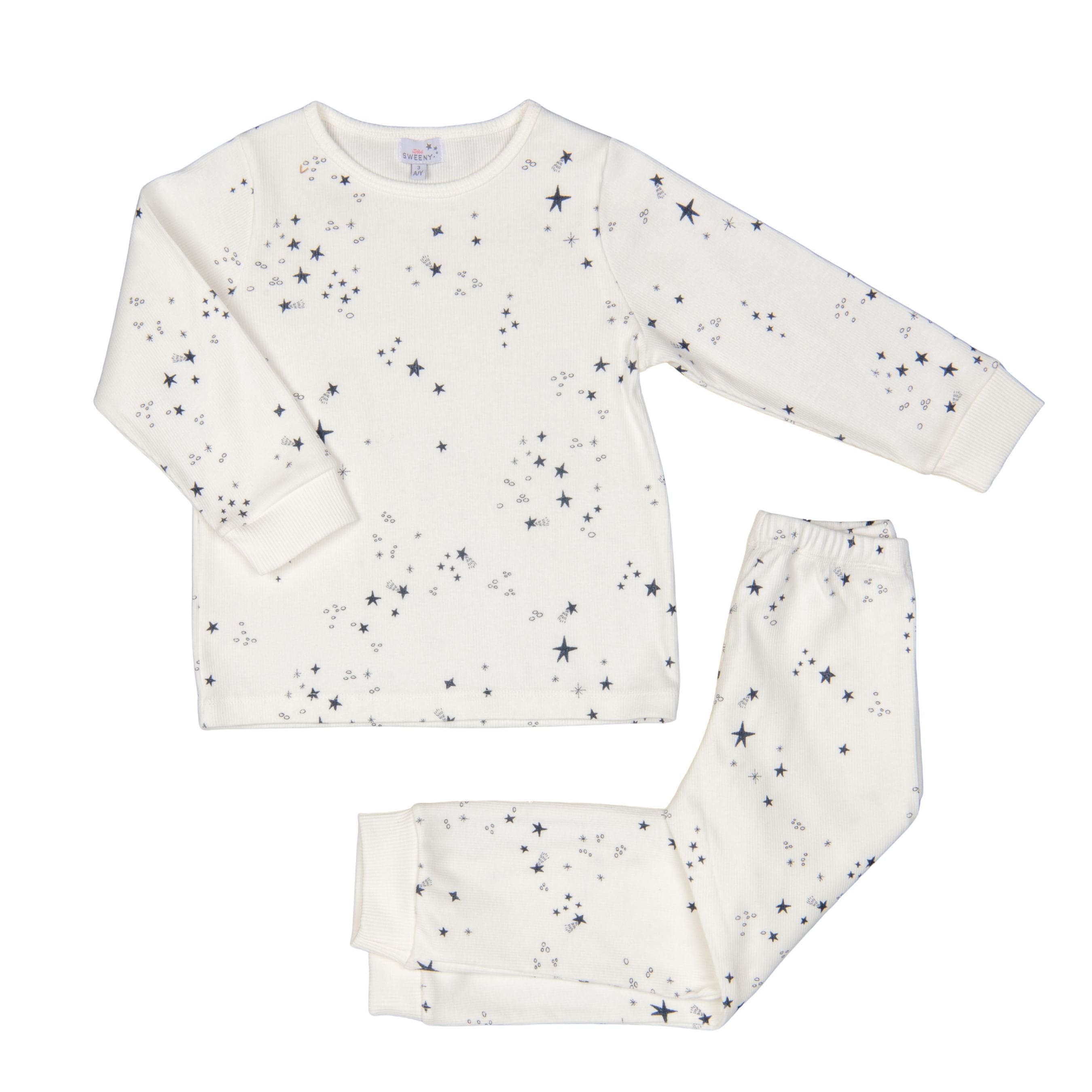 Top with shoulder snap button opening for easy dressing, paired with pants featuring a soft elastic waistband for a comfortable fit. This comfortable pajama set for boys is made from soft ribbed cotton, offering flexibility and a gentle feel. The delicate navy stars print on an ivory base adds a refined and timeless touch.