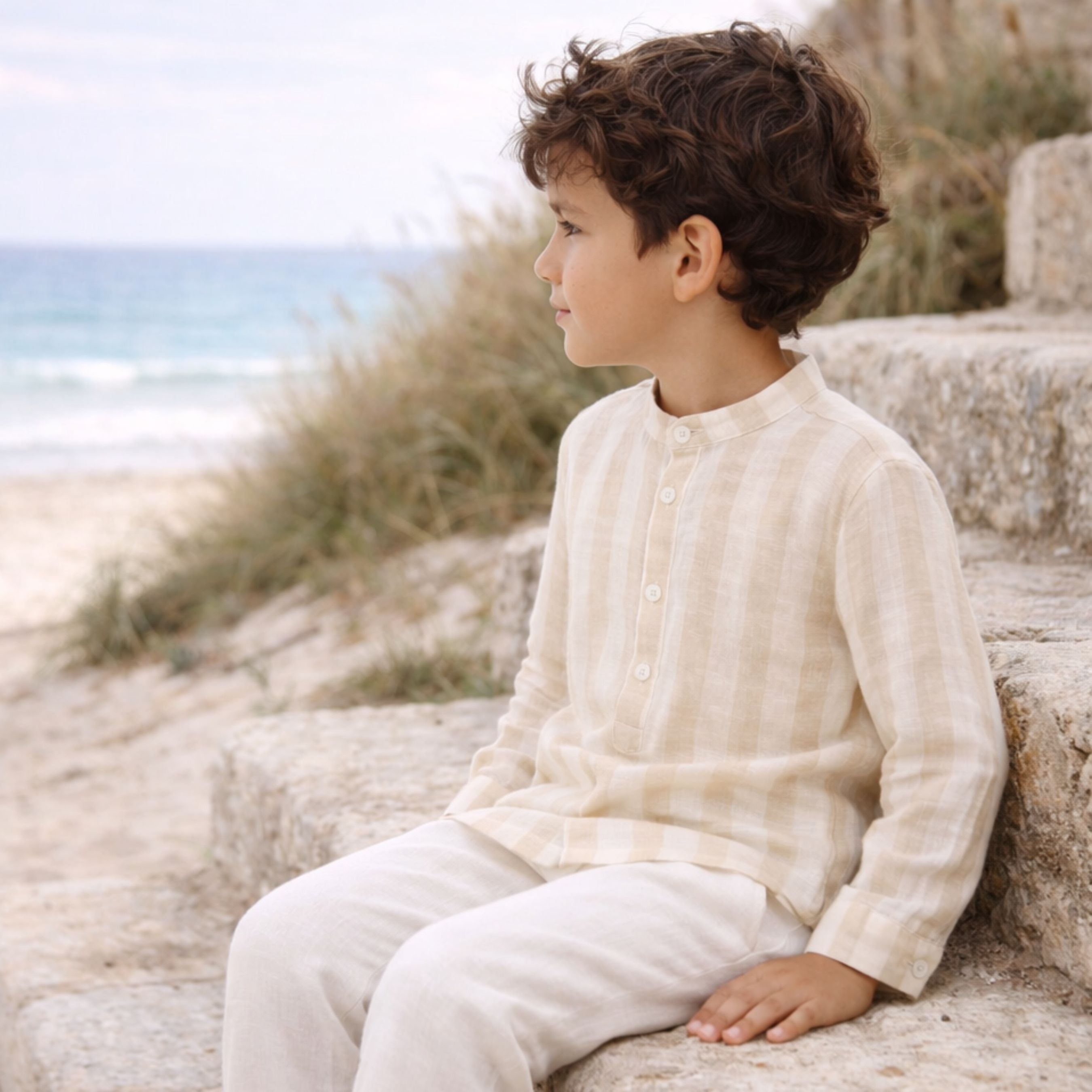 The IGOR shirt is a timeless summer piece crafted from breathable 100% linen. Its soft beige and ivory stripes create a refined and natural look, perfect for warm days by the sea. Designed with a modern stand collar and a front button placket, it offers both comfort and effortless elegance. Easy to pair with linen trousers or shorts for a chic summer outfit.