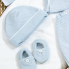 This pale blue baby hat from the Nola collection is crafted in soft quilted cotton, offering comfort and gentle warmth for newborns and babies. A delicate white piping detail adds a refined and timeless finishing touch.