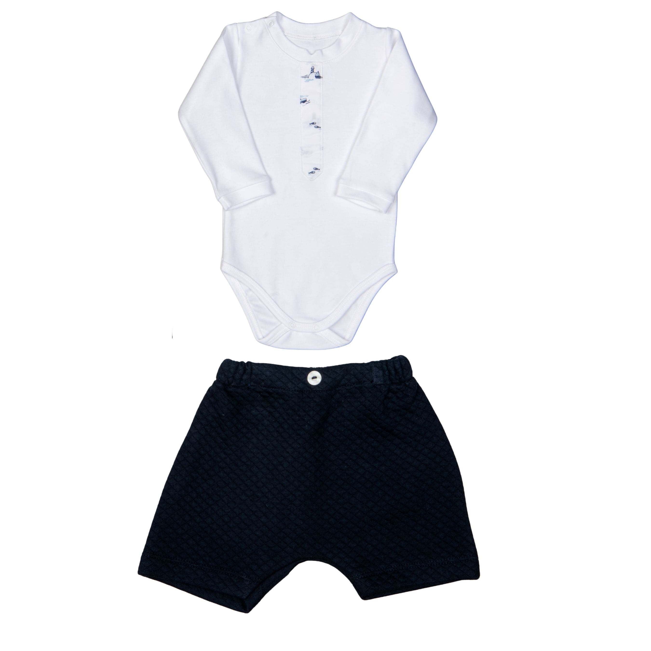 This elegant baby outfit includes a long sleeve bodysuit paired with soft navy quilted shorts for a refined yet comfortable everyday look.