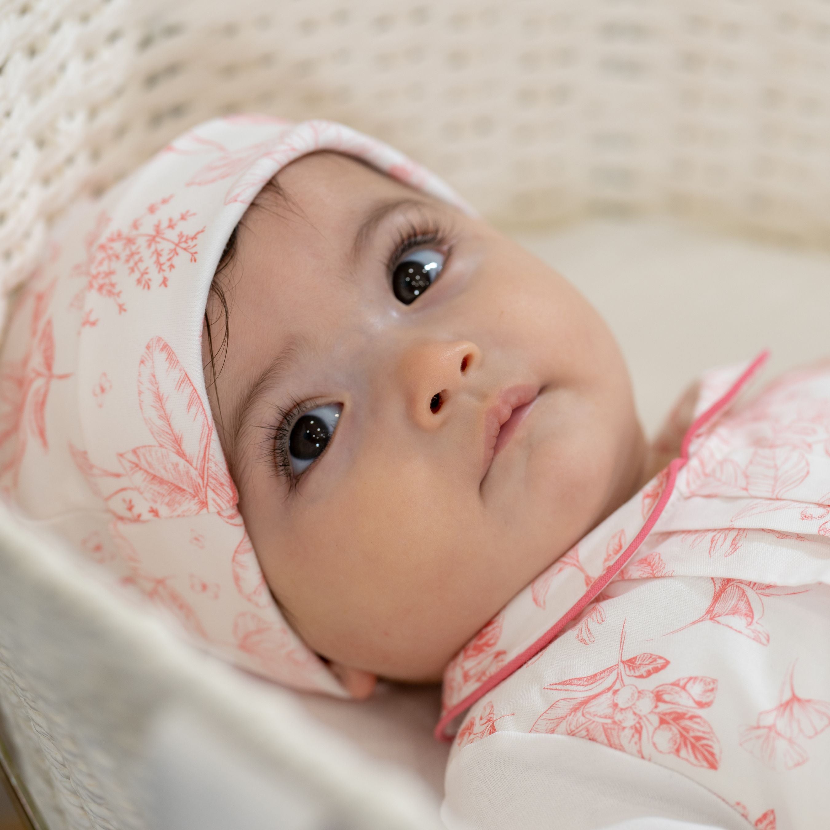 This delicate pink and white baby hat features a refined Toile de Jouy-inspired print, adding a timeless and elegant touch to your newborn’s wardrobe. Crafted from soft and breathable interlock cotton, it is designed to gently protect your baby’s head while ensuring maximum comfort from the very first days. The clean cut and smooth finish make it an essential piece for both everyday wear and special moments.
