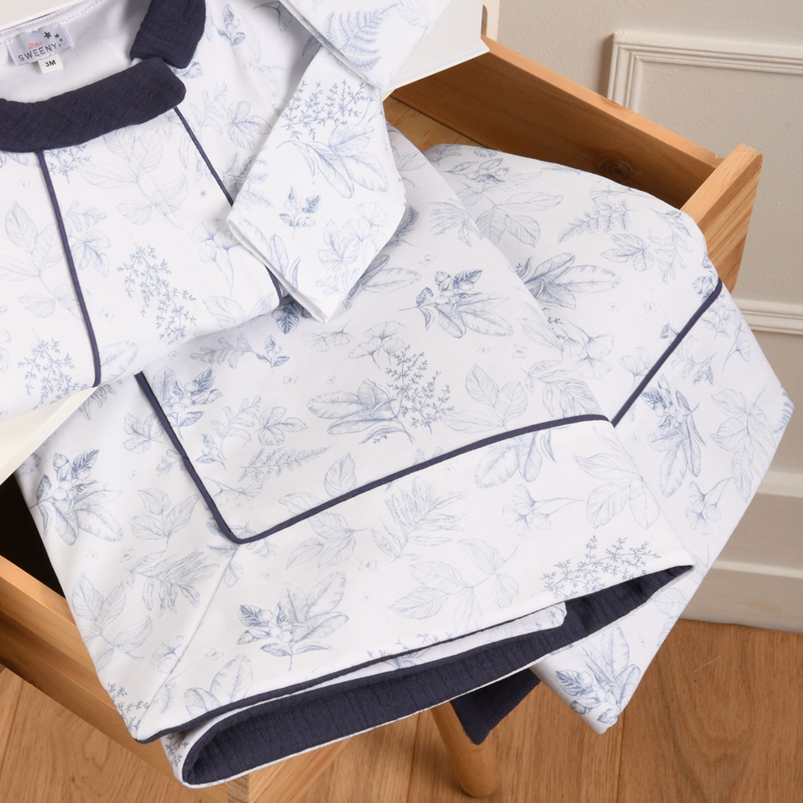 A refined baby blanket featuring our exclusive blue Toile de Jouy print, designed to bring both comfort and elegance. Crafted in softly padded interlock cotton on the front, with a navy double gauze backing, it offers a gentle feel and added warmth. The delicate navy piping adds a clean and elevated finish. Perfect for everyday use, at home or on the go, and an ideal gift for newborns.