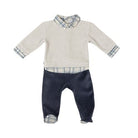Lindo pelele para niño confeccionado en suave y confortable terciopelo. Diseñado para parecerse a un traje de tres piezas, tiene un efecto de "camisa" a cuadros debajo de la parte superior color marfil. El babygrow tiene cierre de botones automáticos en la espalda y parte inferior de color azul marino.