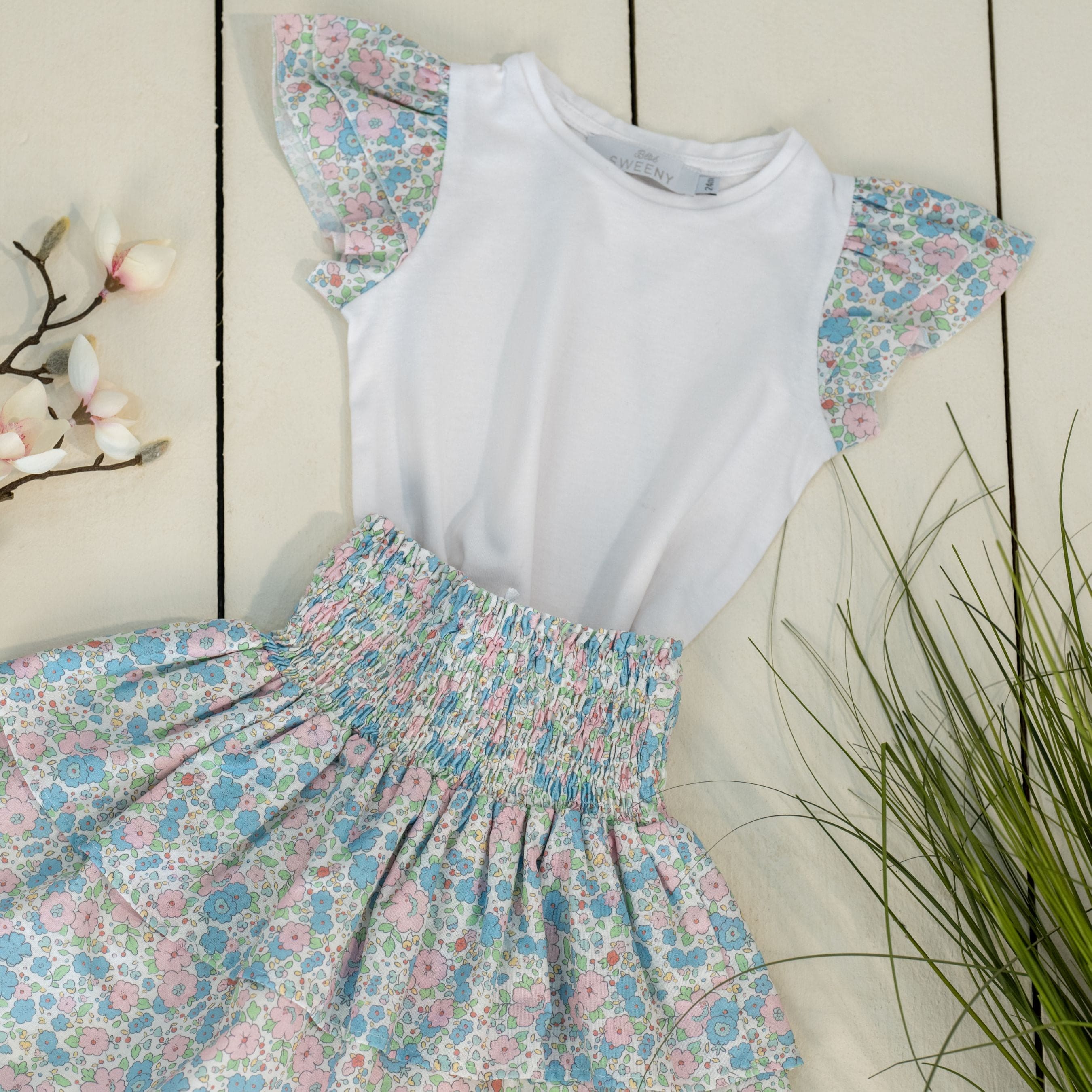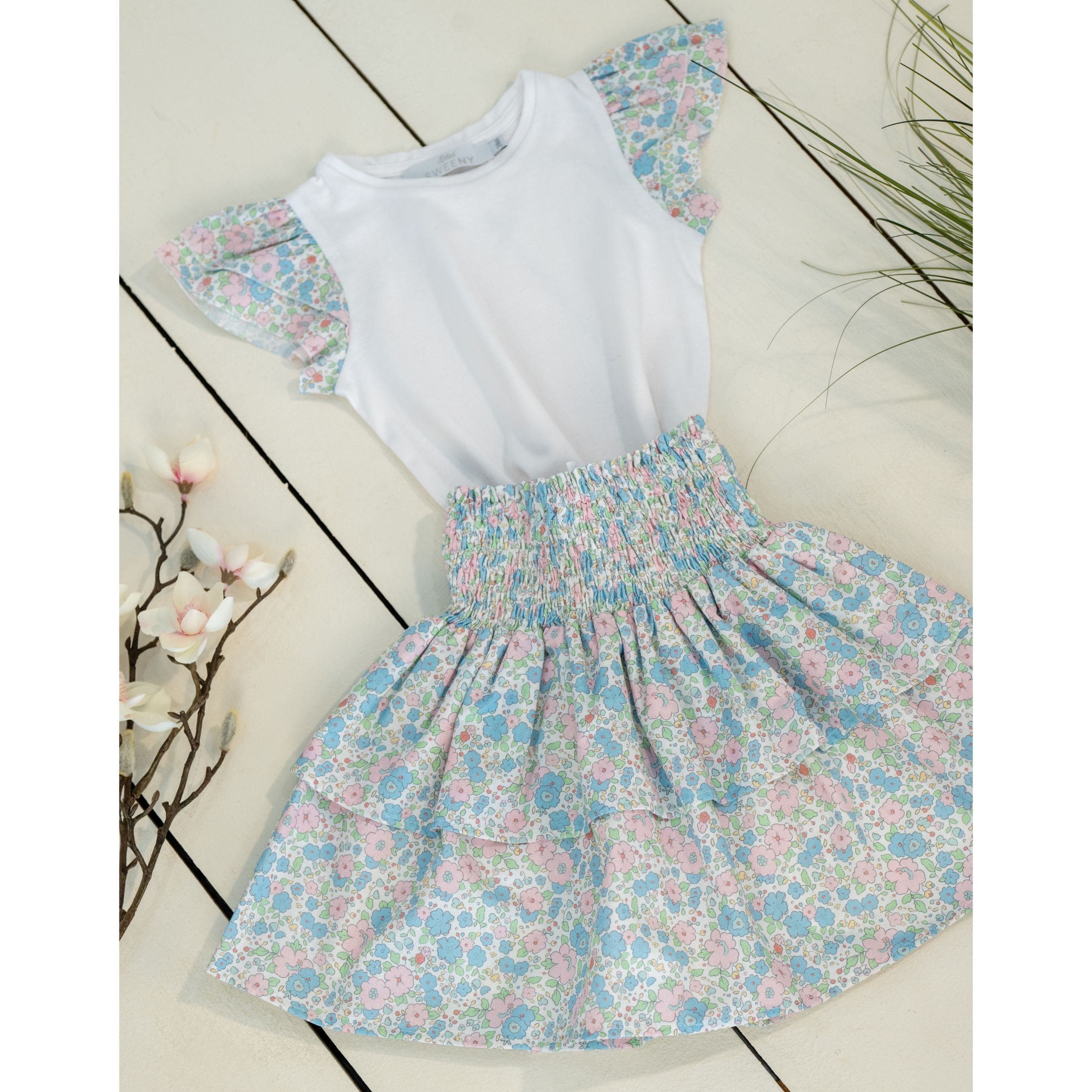 Pretty blue and pink floral print cotton skirt set for girls, ideal for warmer weather. The white cotton jersey top has sweet ruffled sleeves and the tiered skirt has a summery floral print, with a comfortable, shirred waistband.