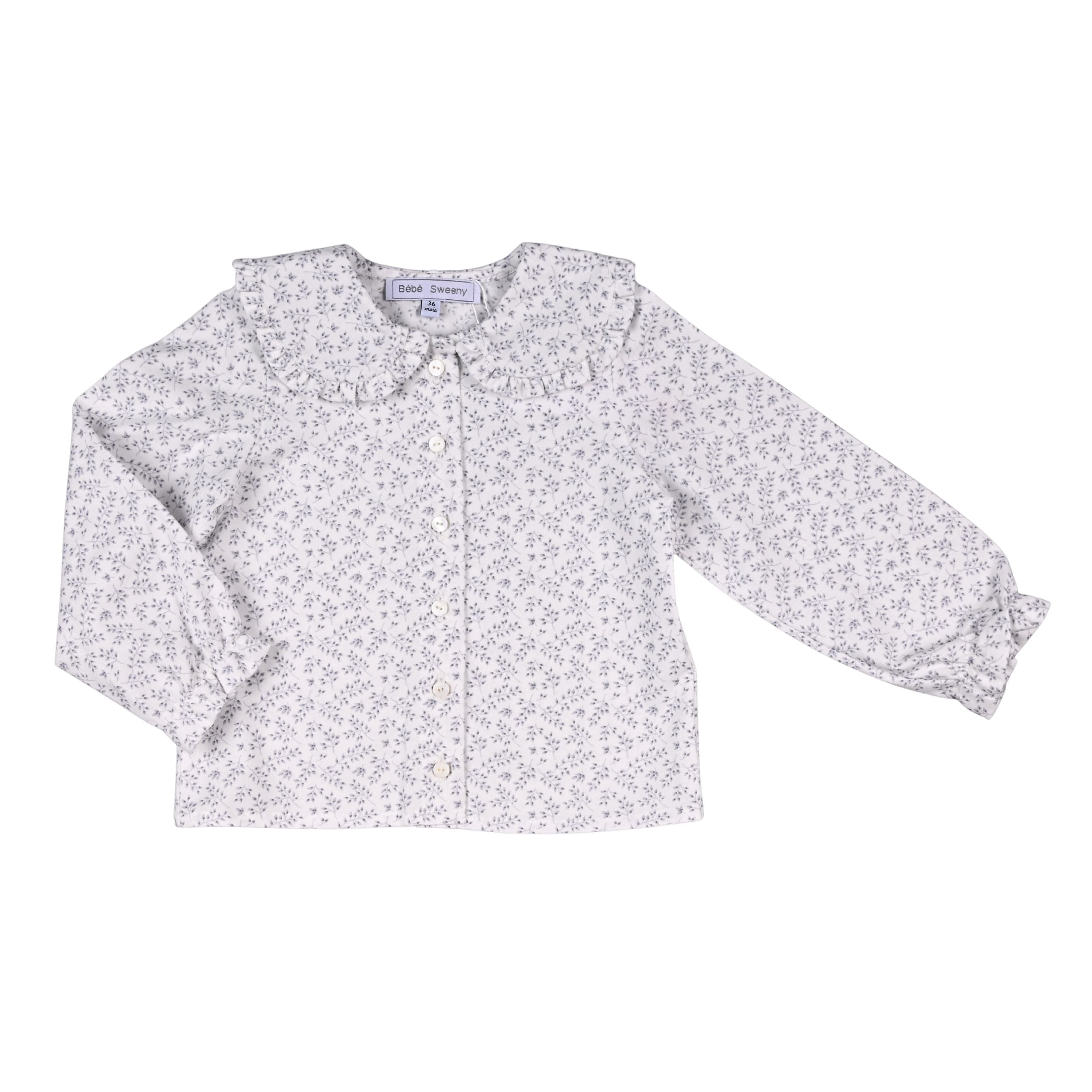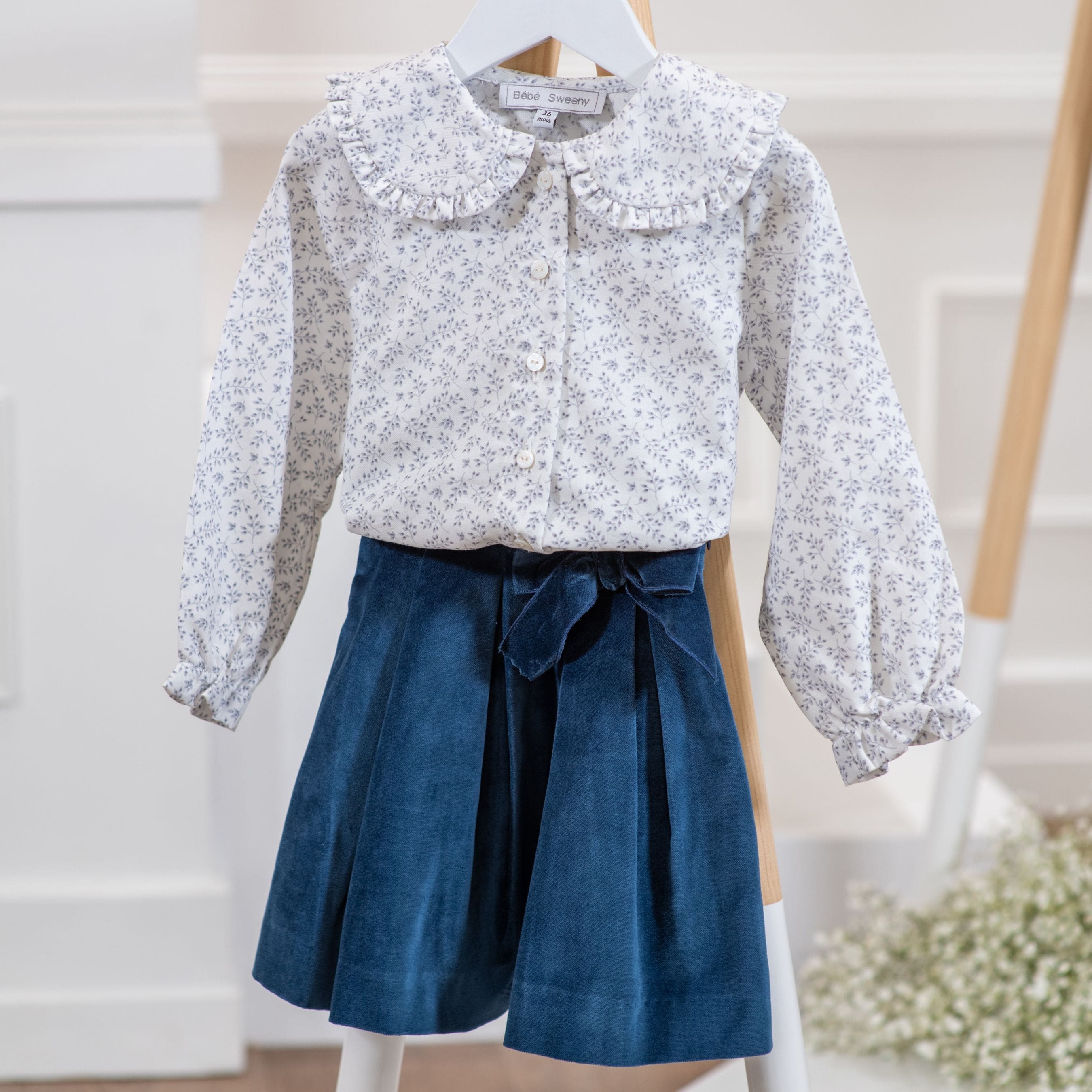 Girls pretty floral blouse, in white with a blue floral pattern. Made in soft and lightweight cotton, this charming collared blouse features ruffle trims and pearly button fastenings on the front. Elasticated at the cuffs, it is both stylish and comfortable. Match this blouse with our Flore skirt to craft a graceful, coordinated look with effortless sophistication.