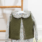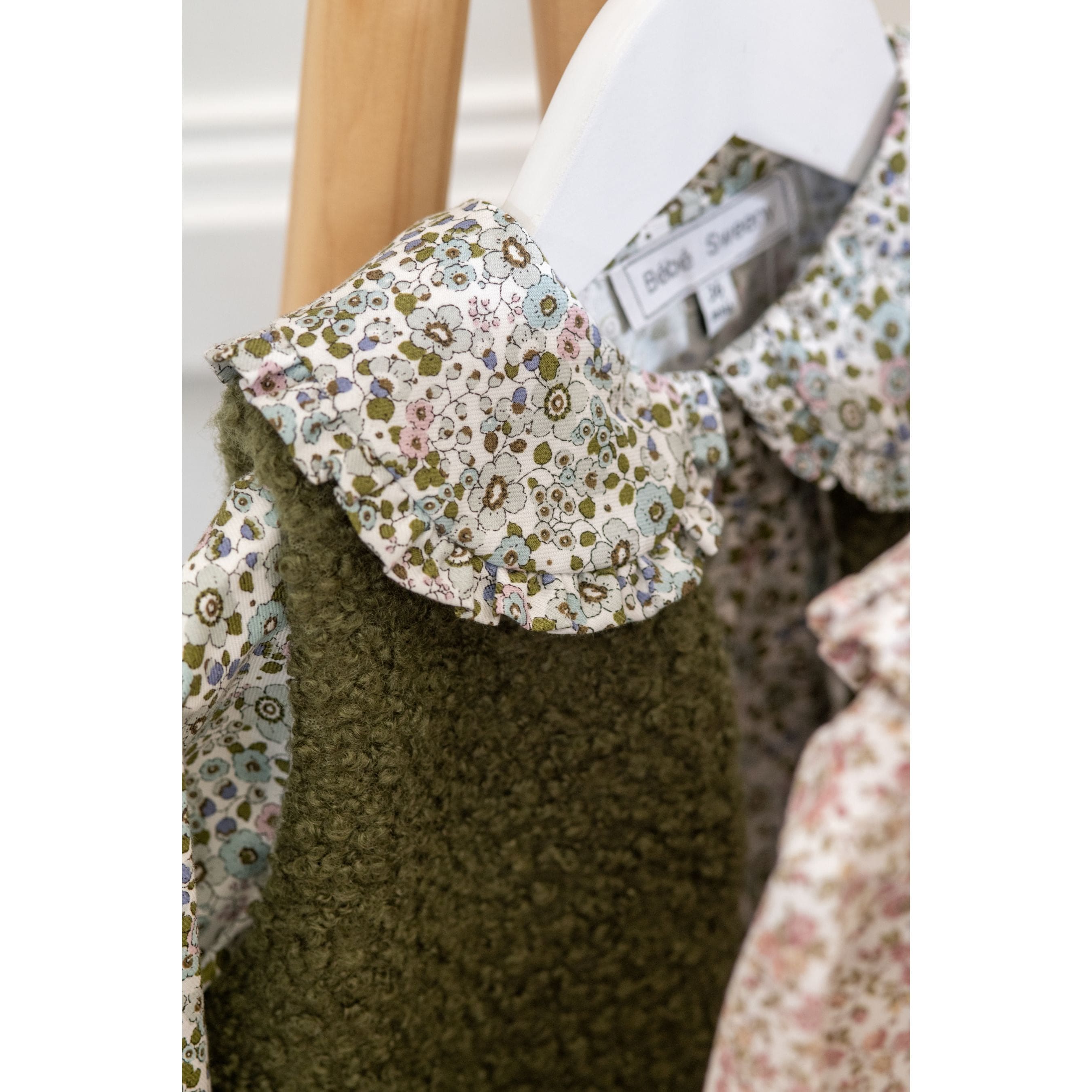 Girls pretty floral blouse, in white with a khaki floral pattern. Made in soft and lightweight cotton, this charming collared blouse features ruffle trims and pearly button fastenings on the front. Elasticated at the cuffs, it is both stylish and comfortable. Match this blouse with our Flore skirt to craft a graceful, coordinated look with effortless sophistication.