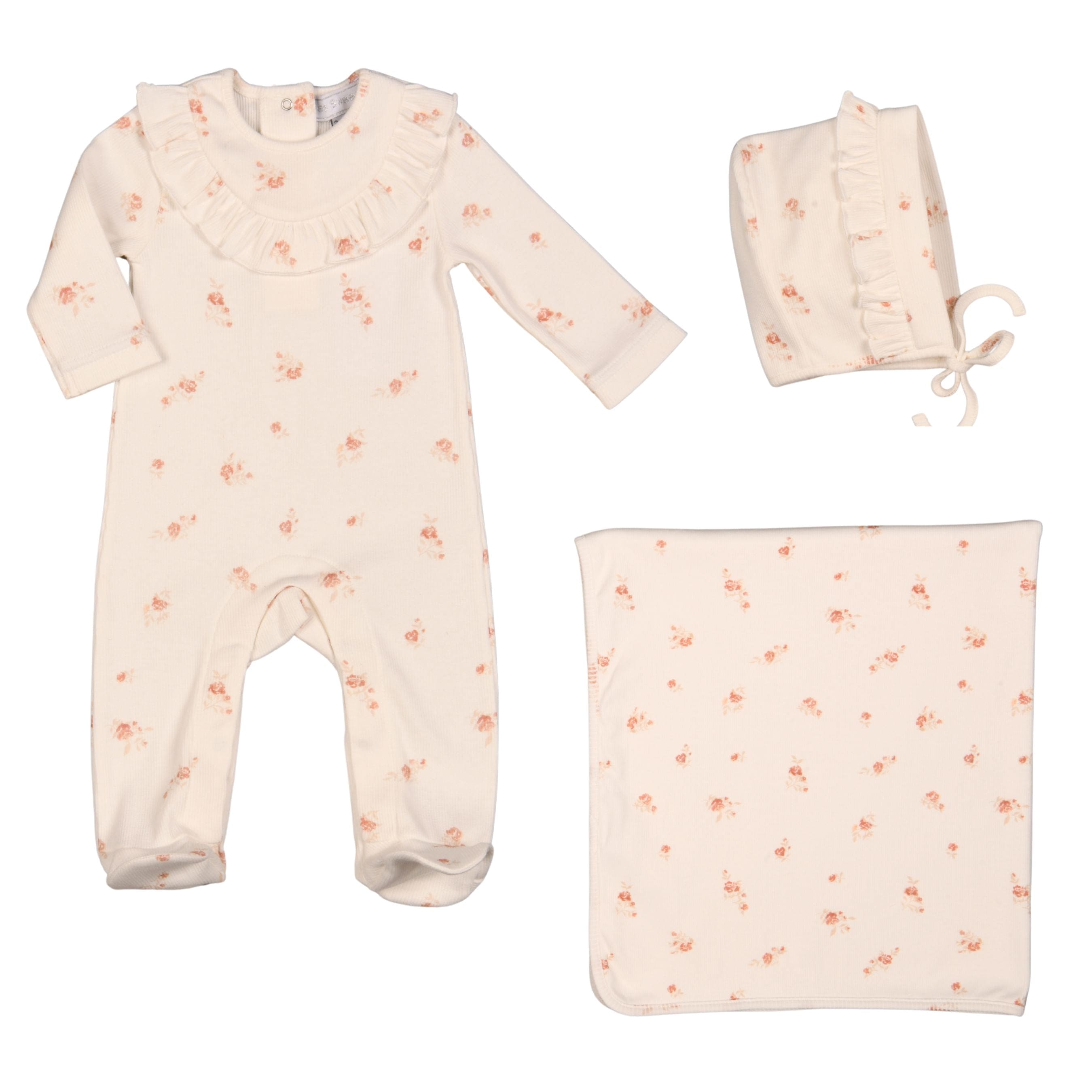 An adorable ivory and pink babysuit set for girls, made in soft ribbed cotton jersey. The babygrow, blanket and hat have matching cute floral prints. The lovely babygrow fastens easily with poppers on the front and between the legs.
